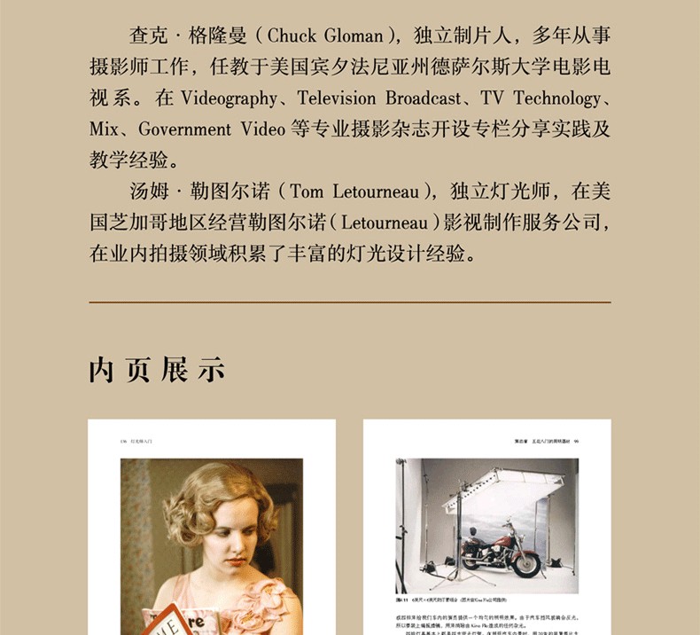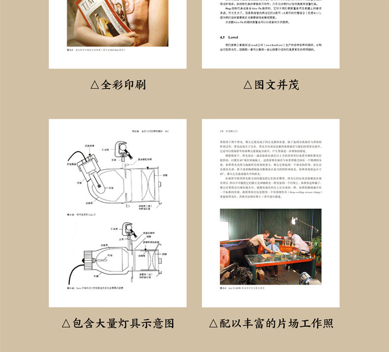 全書配有豐富的照明效果圖、片場工作照、器材實物圖,以及精心繪製的燈位圖、工具示意圖、操作示意圖,甚至詳盡的技術數據圖表,以供攝影師、燈光師、照明電工查閱使用,是一本非常實用的必備工具書。同時,對導演、製片人、影視公司、廣告公司、舞檯燈光從業者乃至影視器材租賃公司均有參考價值。