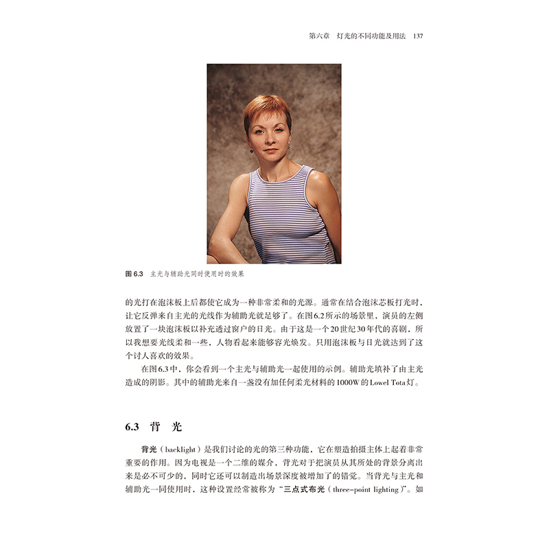 · 給特定情景打光的章節會伴有課後練習,讓學生使用同樣的器材去重複模擬這個燈光設定。此外,還鼓勵學生使用他們自己的方法來達到同樣的效果或創造出其他不同的效果。