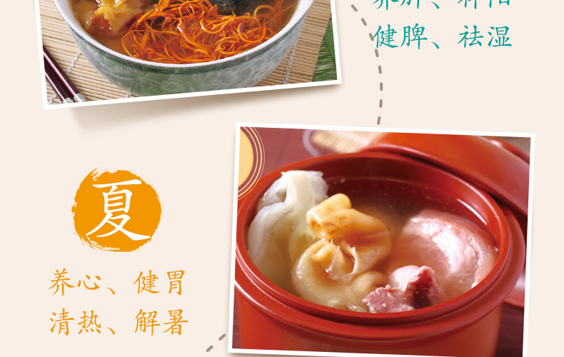 夏季到來,萬物繁榮,群芳鬥艷,人體的新陳代謝也到了最旺盛的時期。一年四季中,夏屬火,酷熱登場,暑氣容易乘虛而入,養生宜清熱、解暑;心主火,盛夏晝長夜短,易心火過旺,暑熱傷氣,氣虛則兼見胃納欠佳、四肢疲乏、精神萎靡,因此,要注重養心、健胃。 《廣東靚湯2》根據夏季的氣候特點,為讀者推薦了養心、健胃、清熱、解暑四類適時湯品,並詳細講解了近百款湯品的製作方法、營養功效和烹飪竅門。