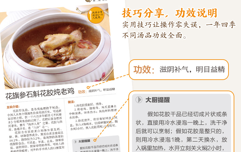 春回大地,在綿綿細雨的滋潤下,萬物生髮,人體的陽氣也向上向外宣發。中醫學認為,春是肝當令,養生宜養肝、補陽。同時,春天氣候變化較大,加之人體皮膚開始變得疏泄,對寒濕的抵禦能力有所減弱,因此,要慎避濕寒與風邪,養生須著重健脾、祛濕。 《廣東靚湯1》根據春季的氣候特點,為讀者推薦了養肝、補陽、健脾、祛濕四類適時湯品,並詳細講解了近百款湯品的製作方法、營養功效和烹飪竅門。