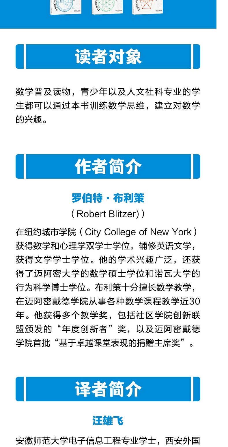 本書是一本數學普及讀物,想解決數學學習者的兩大問題:學不懂數學的問題和用不上數學的問題。針對讀者面臨的這兩個問題,書中用了大量生活中的案例系統性地介紹了初等數學思維,這在國內比較少見。因此,本書適合初高中生、人文社科類的大學生以及任何對數學感興趣的讀者。本書十大看點:1.通過分類和歸納信息來整理和安排日常生活2.使用邏輯來評價別人的論斷,並更有效率地發表自己的觀點3.理解前沿技術與古老數字表示系統之間的關係4.讀懂新聞中的數字,認識國債,理解 1 萬億元究竟是多少錢5.使用數學模型來直觀地理解事物,包括幽默與歡笑對人生的積極影響6.使用諸如存款、貸款和投資等基本概念來實現理財目標7.使用幾何來學習你所在世界的形狀,培養你對自然形狀和美的欣賞眼光8.理解統計學的基礎以及人們是如何使用數字做決定的9.理解民主政治的投票悖論10.使用圖論來分析人們是如何使用數學來解決商務問題的