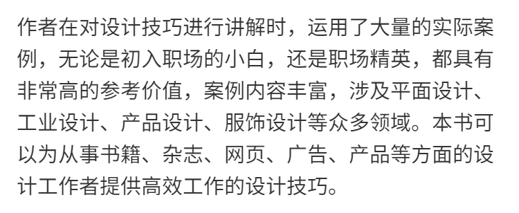 作者在對設計技巧進行講解時,運用了大量的實際案例,無論是初入職場的小白,還是職場精英,都具有非常高的參考價值,案例內容豐富,涉及平面設計、工業設計、產品設計、服飾設計等眾多領域。本書可以為從事書籍、雜誌、網頁、廣告、產品等方面的設計工作者提供高效工作的設計技巧。