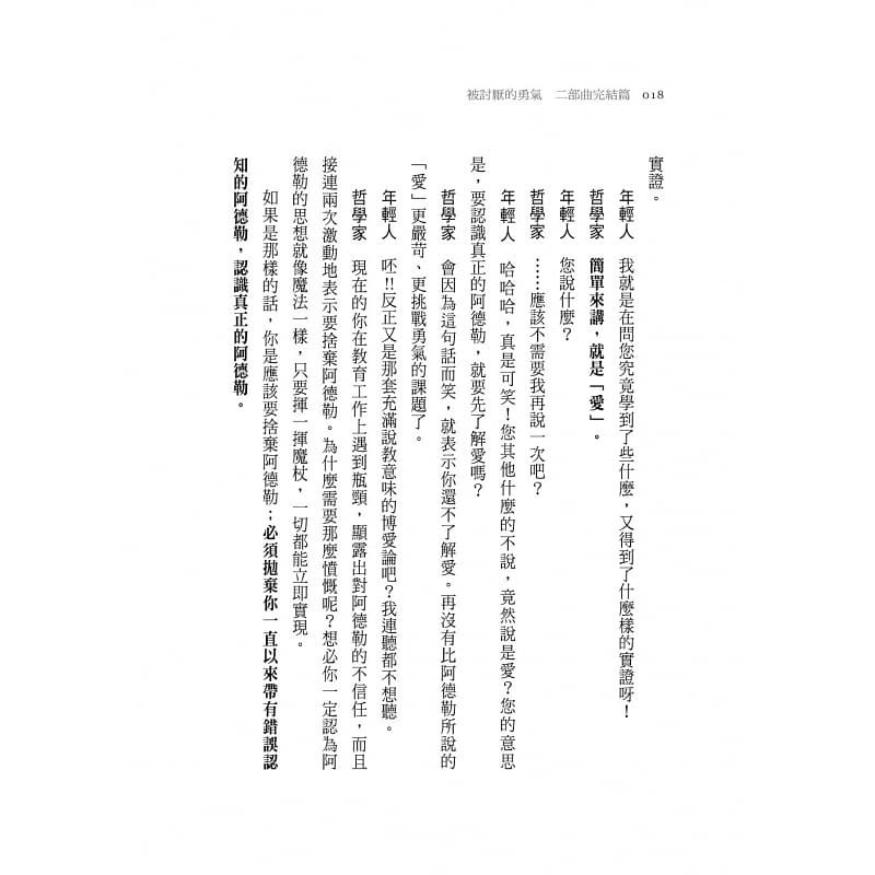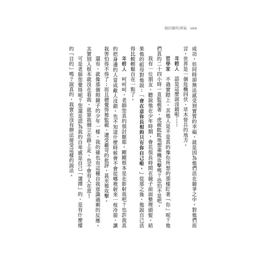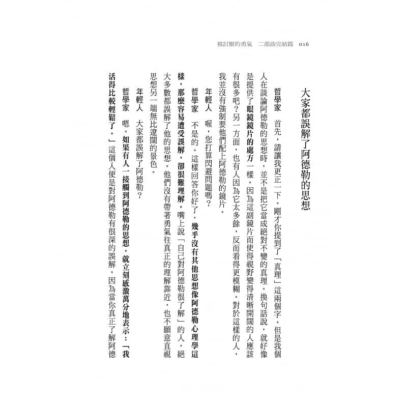 ◆在內容上,本書對於前作《被討厭的勇氣》中所提到的阿德勒心理學重點之一──人生任務和社會意識有更深的探討,對於工作的目的,也讓我豁然開朗,不但很合理,更讓我對工作的態度有了改變。