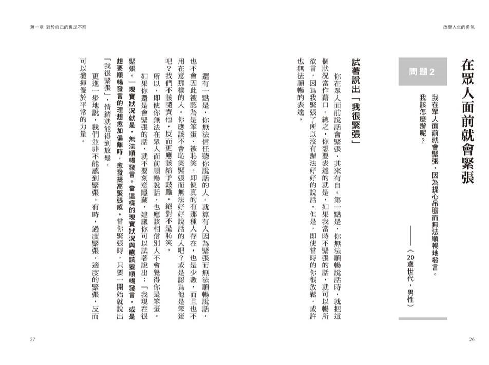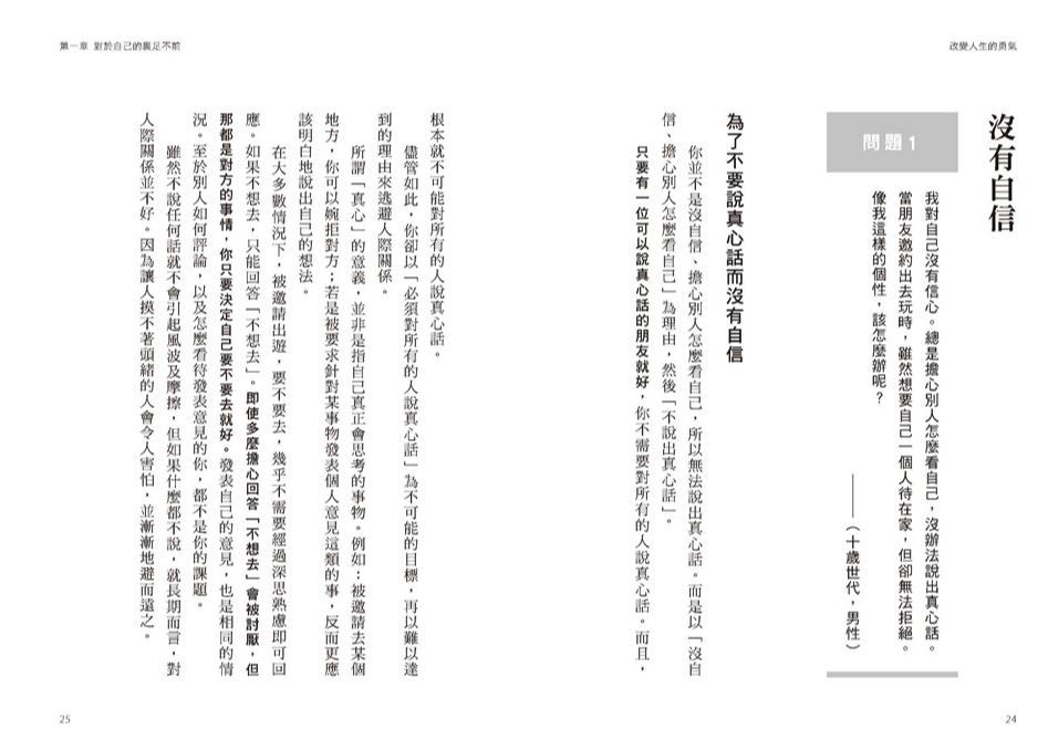 你並不是沒自信、擔心別人怎麼看,所以不敢說真話。而是以「沒自信、擔心別人怎麼看」為理由,然後「不說出真心話」。只要有一位可以說真心話的朋友就好,你完全不需要對所有的人說真心話。而且,根本就不可能對所有人說真心話。雖然不說話就不會引起風波及產生摩擦,但什麼都不說,對人際關係的長期發展來說,並不是一件好事。因為讓人摸不著頭緒的人,會令人害怕,並漸漸避而遠之。
