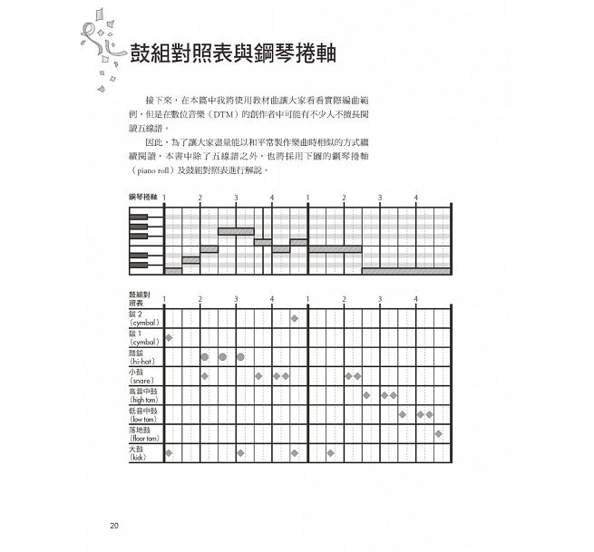 ⊙鼓組對照表+鋼琴卷軸+五線譜,譜例豐富好理解