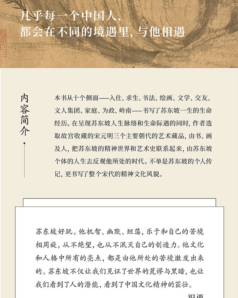 ◎在故宮藏品中, 尋找蘇東坡的生命印跡◎展閱宋元明書畫,試圖理解蘇東坡與他的時代◎本書收錄兩岸故宮及海內外博物館數十幅高清詳圖,呈現蘇東坡書法與繪畫之美本書從十個側面——入仕、求生、書法、繪畫、文學、交友、文人集團、家庭、為政、嶺南——書寫了蘇東坡一生的生命經歷。在呈現蘇東坡人生脈絡和生命際遇的同時,作者選取故宮收藏的宋元明三個主要朝代的藝術藏品,由書、畫及人,把蘇東坡的精神世界和藝術史聯繫起來,由蘇東坡個體的人生去反觀他所處的時代。不單是蘇東坡的個人傳記,更書寫了整個宋代的精神文化風貌。蘇東坡好玩。他機智、幽默、坦蕩,樂於和自己的苦境相周旋,從不絕望,也從不泯滅自己的創造力。他文化和人格中所有的亮點,都是由他所處的苦境激發出來的。蘇東坡不僅讓我們見證了世界的荒謬與黑暗,也讓我們看到了人的潛能,看到了中國文化精神的茁壯。