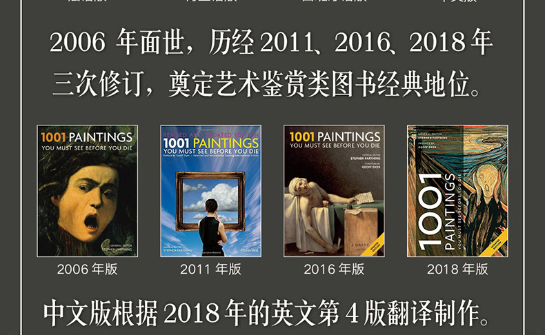《有生之年一定要看的1001幅畫》是一部以時間線串起經典作品的“人類繪畫編年史”,由英國皇家藝術研究院院士、畫家史蒂芬·法辛擔綱主編。 83位藝術家、博物館管理者、藝術評論家和藝術品收藏人組成的撰稿人團隊對3500年人類繪畫680餘位畫家的1001幅代表作進行了兼具專業性與知識性的品評,圖文並茂地呈現了人類文明璀璨的藝術遺產。英文版於2006年初次面世,歷經2011年、2016年和2018年的三次修訂,已被翻譯成16種語言出版,累計銷量超過50萬冊。本次中文版根據2018年的英文第4版翻譯製作。