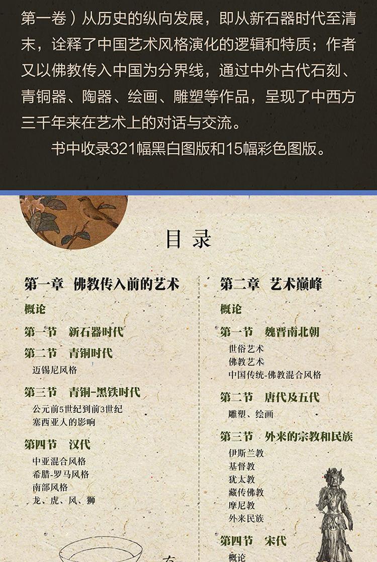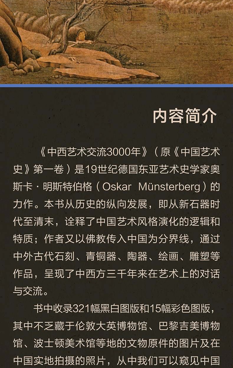 《中西藝術交流3000年》(原《中國藝術史》第一卷)是19世紀德國東亞藝術史學家奧斯卡·明斯特伯格(OskarMünsterberg)的力作。本書從歷史的縱向發展,即從新石器時代至清末,詮釋了中國藝術風格演化的邏輯和特質;作者又以佛教傳入中國為分界線,通過中外古代石刻、青銅器、陶器、繪畫、雕塑等作品,呈現了中西方三千年來在藝術上的對話與交流。書中收錄321幅黑白圖版和15幅彩色圖版,其中不乏藏於倫敦大英博物館、巴黎吉美博物館、波士頓美術館等地的文物原件的圖片及在中國實地拍攝的照片,從中我們可以窺見中國傳統藝術在歷史長河中的蓬勃發展。