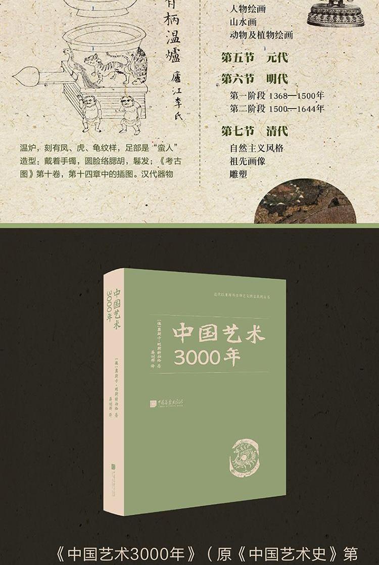 《中國藝術3000年》(原《中國藝術史》第二卷)是19世紀德國東亞藝術史學家奧斯卡·明斯特伯格(Oskar Münsterberg)的力作。本書分為建築藝術和工藝美術兩大部分,涵蓋了中國古代建築、青銅器、陶瓷、寶石製品、印刷品、織物、漆器與木器、琉璃、琺瑯、犀角、玳瑁、琥珀、象牙等器物近1200件,通過藝術作品本身所展現的審美趣味,釐清中國藝術的發展脈絡。
