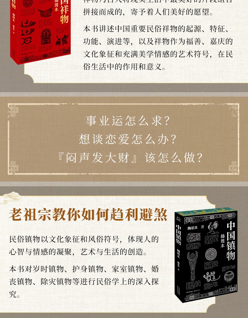 本書內含:歲時祥物、建築祥物、器用祥物、交通祥物、禮儀祥物、天地祥物、吉神吉仙、物種祥物、飲食祥物、文字圖畫。引證了大量的有趣實例,並做出了嚴謹的闡釋。
