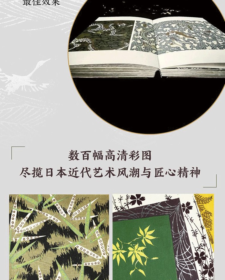 ②裸脊包布精裝,展現當代「復古」風格。封面模擬琳派屏風效果,內文前4頁精選版畫,陝線工藝,復刻明治時代的手工藝效果,可直 接完整撕下裝裱。裸脊方便平攤,展現跨頁圖的最佳效果。