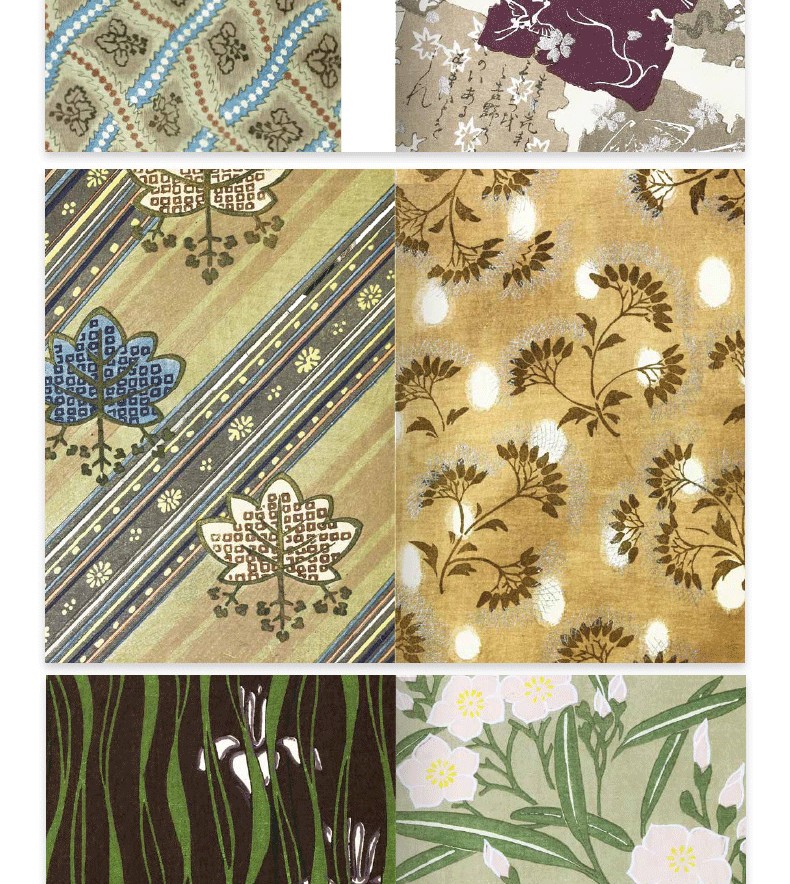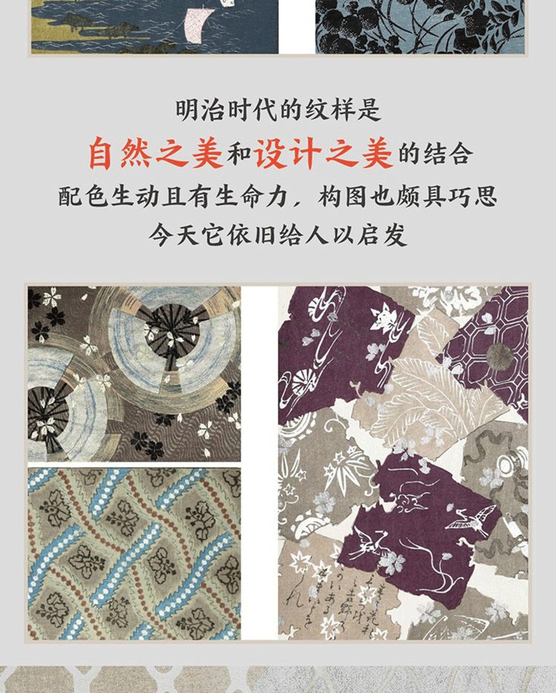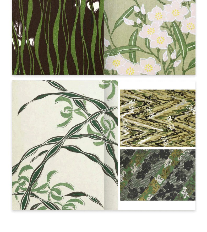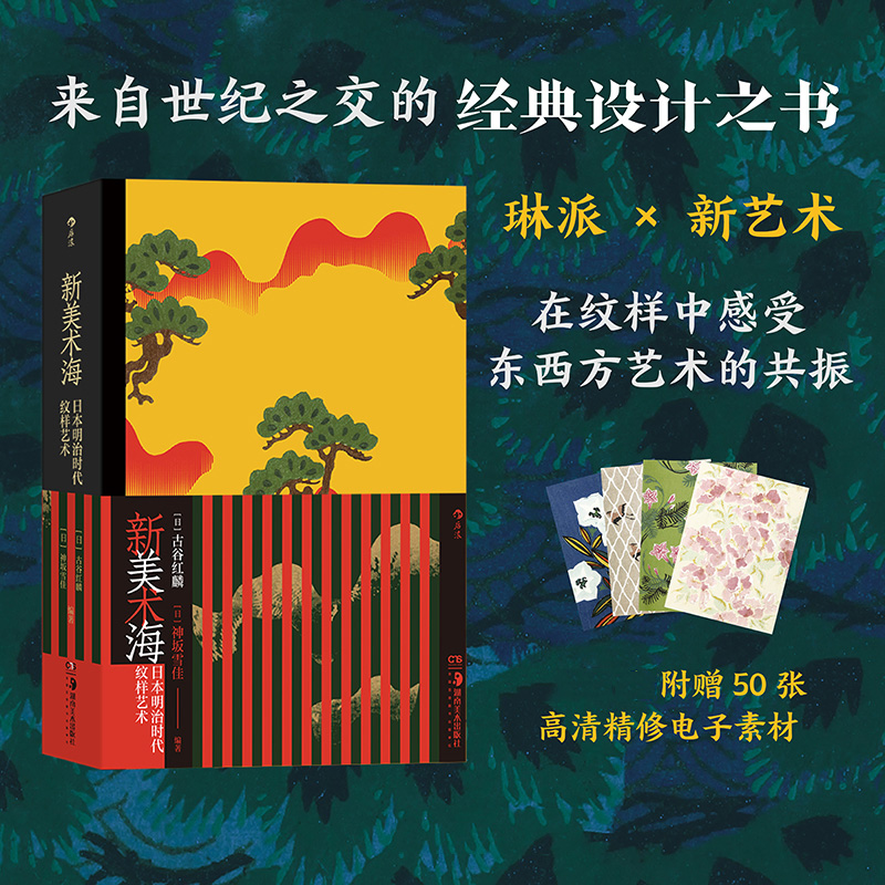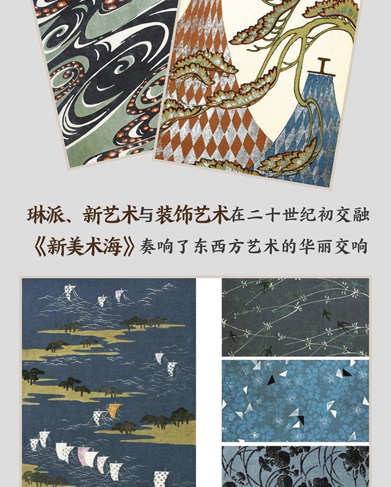《新美術海》是開創日本現代設計先河的圖案設計精選,東方琳派與西方新藝術運動的完美融合。其中收錄的圖案多以花鳥風月、四季景色為主題,是自然之美和設計之美的結合。這些紋樣配色生動且有生命力,構圖也頗具巧思,作品雖為20世紀初所作,即使在一百多年後的今天,仍然能給人以啟發。
