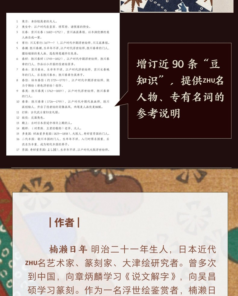 [日]楠瀨日年,明治二十一年(1888)生人,日本近代著名藝術家、篆刻家、大津繪研究者。曾多次到中國,向章炳麟學習《說文解字》,向吳昌碩學習篆刻,著有《篆刻新解》《書齋管見》等。身為浮世繪鑑賞者,楠瀨日年潛心挖掘浮世繪紋樣的價值,盡顯畫師們令創作神似、盡美、富於變化的孜孜用心。