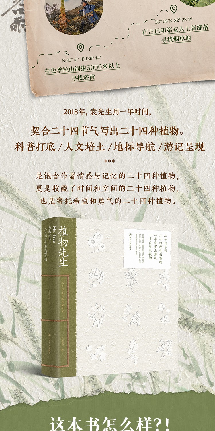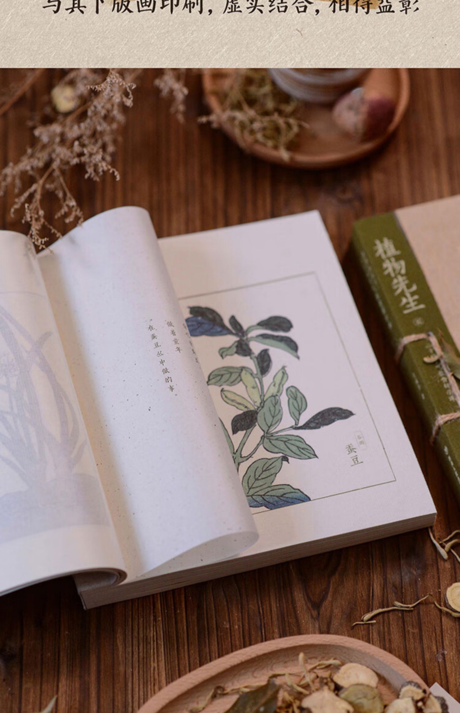 《植物先生:二十四節氣植物研學課》以二十四節氣為綱,從身邊的植物入手,介紹了應時而生的二十四種植物,如蠟梅、白玉蘭、油菜花、桑樹、楓楊樹、合歡樹、蜀葵花、無患子等。每篇文章構思精巧如小品文,由自然、四時、植物進入人文、歷史、風俗,進入人的內心,既有硬核植物知識的介紹,又有感時花濺淚的詩情畫意,繼承了中國文人的感傷時事心憂天下的寫作傳統,同時提供開闊的眼界,傳遞全新的、綠色的生活理念,是一部賞心悅目的美文集。