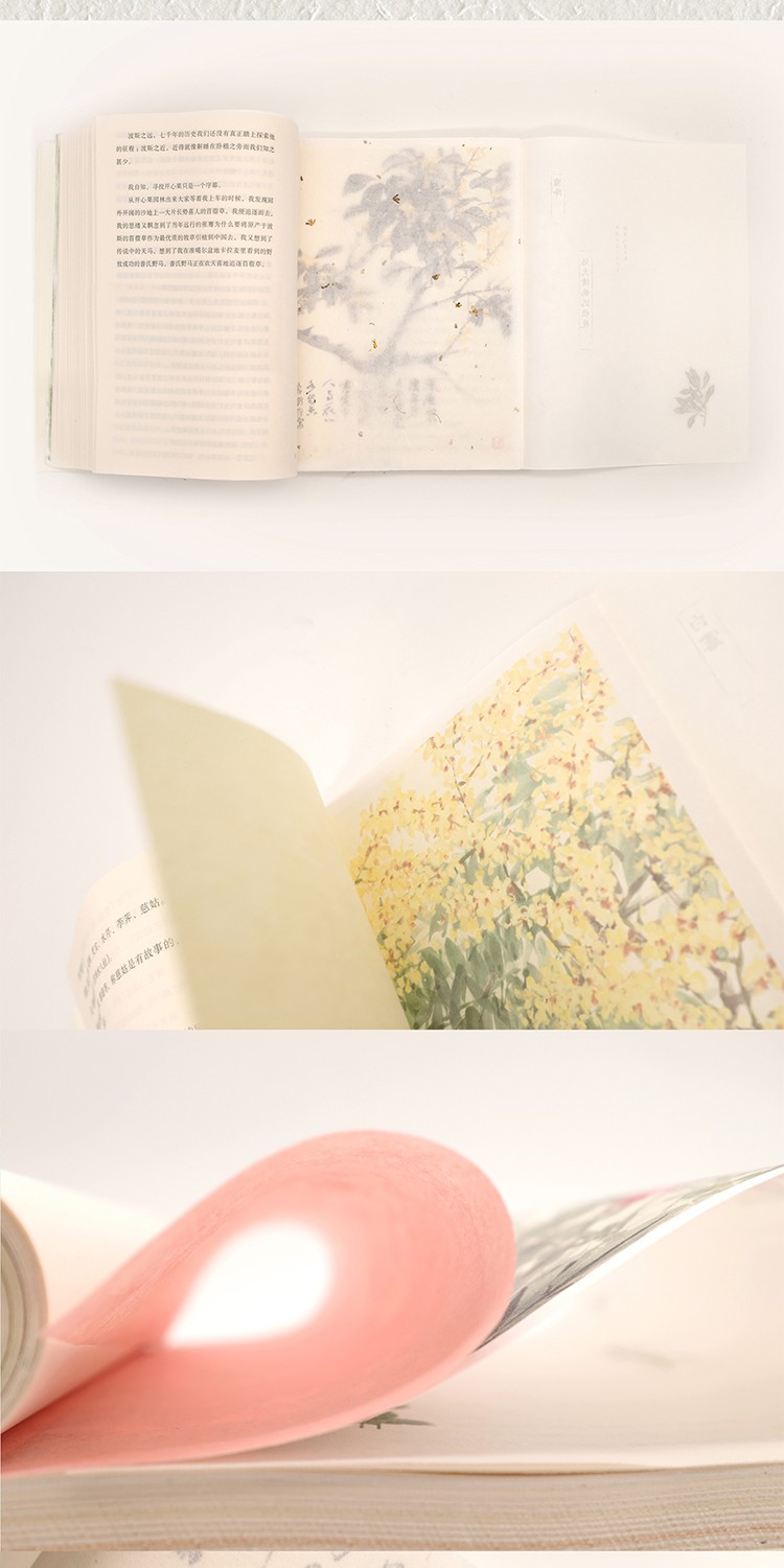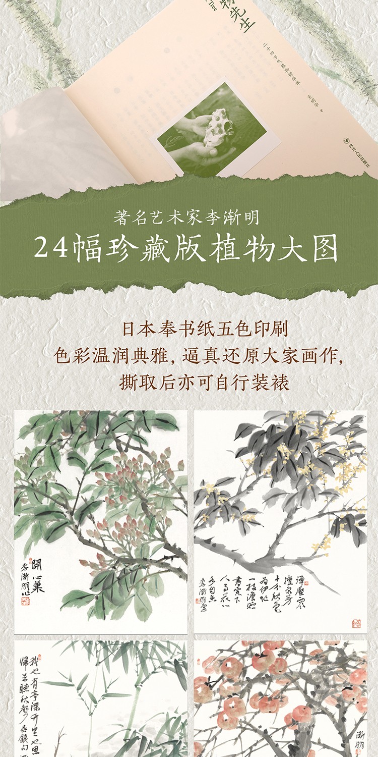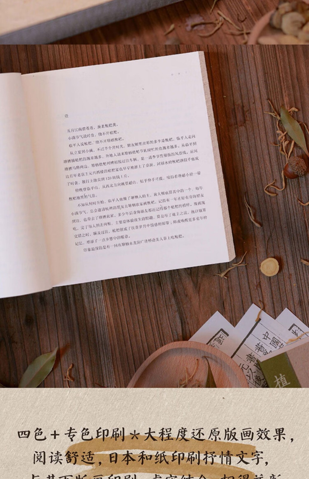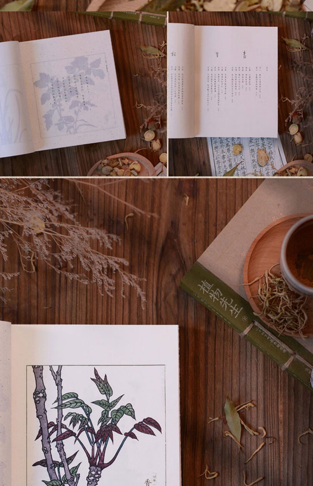 本書全手工鎖線裝訂,研發二十四種花草紙,與二十四篇文章、二十四幅彩圖氣息相通,形神統一,共同呈現植物之美。
