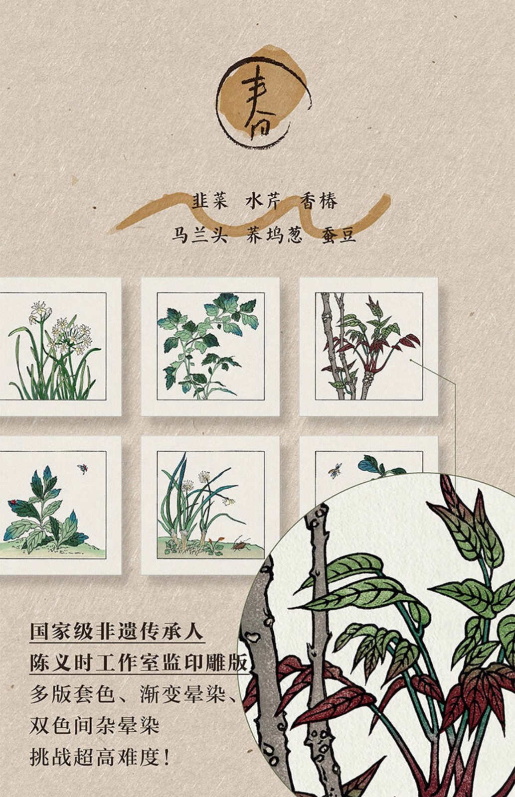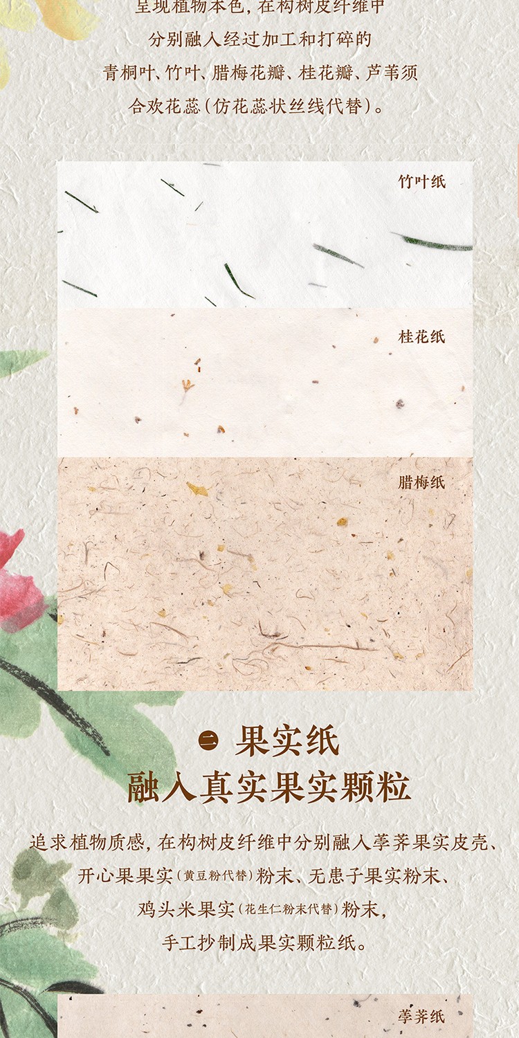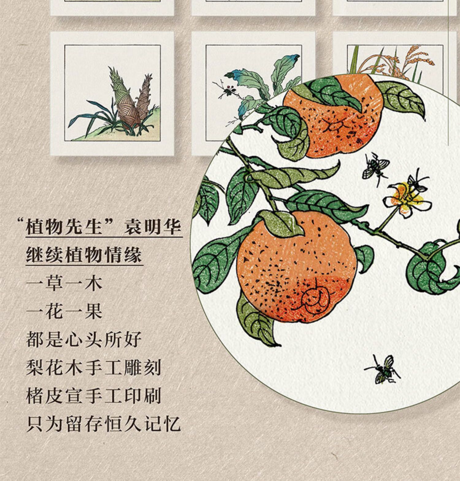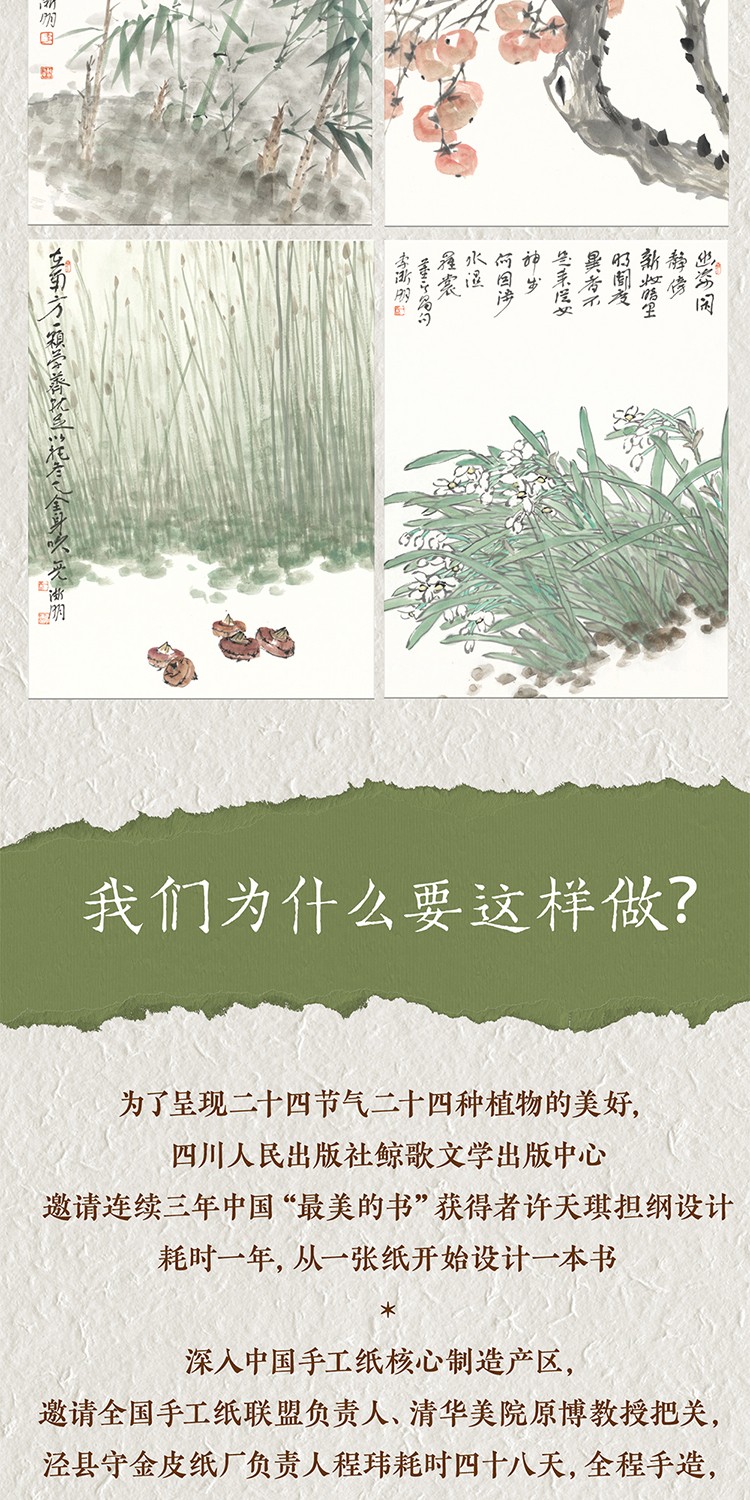 本書全手工鎖線裝訂,研發二十四種花草紙,與二十四篇文章、二十四幅彩圖氣息相通,形神統一,共同呈現植物之美。