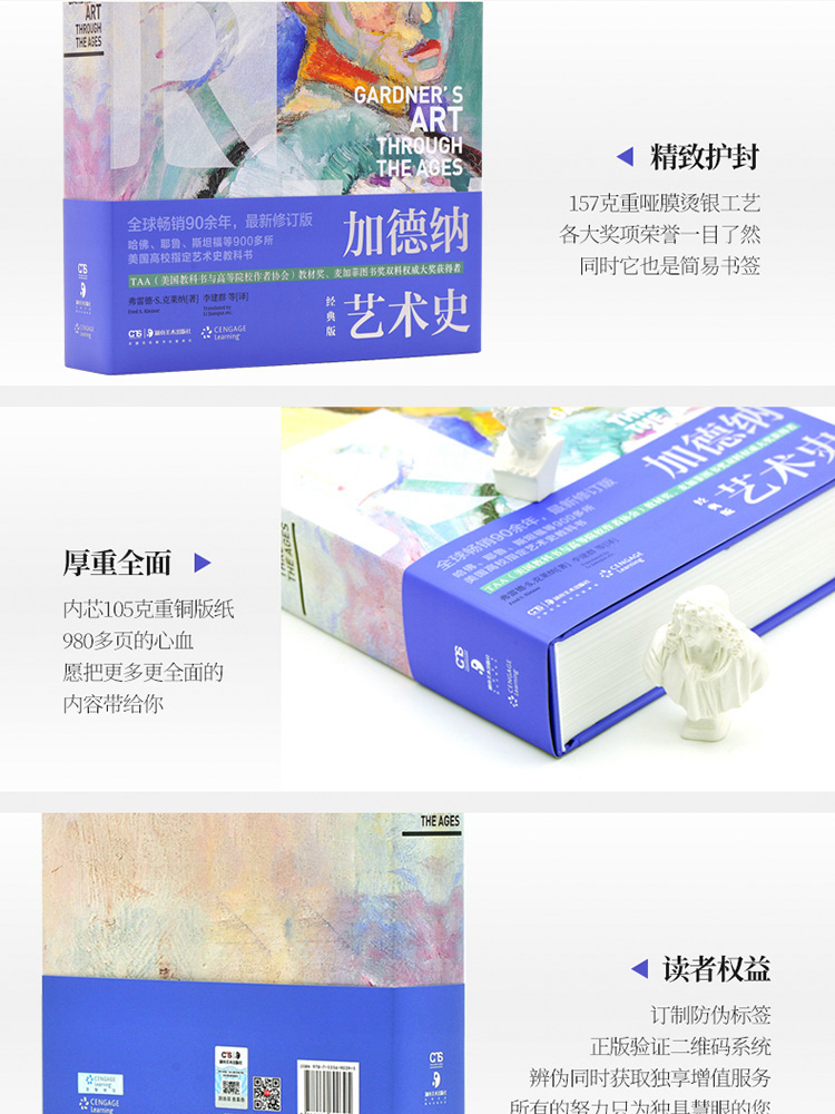 《加德納藝術史》經典版譯自世界知名藝術史 Gardner’s Art Through the Ages 第15版。本書自海倫 加德納1926年首次出版以來,一直廣受好評,不斷再版,堪稱讀者多、流傳廣的藝術通史;本書先後被哈佛、耶魯等著名大學甚至美國精英高中選為教材。本書遵循加德納的基本框架,以“全景化”視角展示藝術發展美的歷程。全書共38章,近125萬字,收錄近1700張高清圖片;涵蓋從史前到現當代藝術,廣涉繪畫、雕塑、建築、設計、攝影及工藝美術等諸多藝術門類。