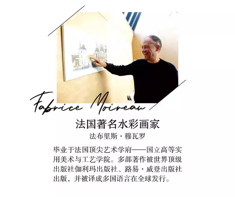 法布里斯•穆瓦羅,水彩畫家,畢業於法國國立高等實用美術與工藝學院,常年四處遊歷,醉心於描繪大自然和建築遺產,擅長用水彩畫的形式來表現大自然微妙的光影變化以及城市、街道風景的神韻。其多部著作由伽利瑪出版社、路易•威登出版社出版,並譯成多國語言在全球發行,其中代表性的作品是描繪世界各地名城風貌和人文歷史的水彩筆記系列,該系列包括《巴黎水彩筆記》《佛羅倫薩水彩筆記》《普羅旺斯水彩筆記》等多本分冊。