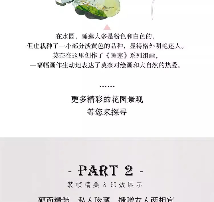 本書是一本人文主題的水彩畫集,用圖文並茂的方式為大家介紹了莫內親自設計、精心打造、視為珍寶的花園。莫內的花園分為花園和水園兩部分,花園名為“諾曼底園”,種植著他鍾愛的各種花草,四季花開不斷;水園則是一個曲徑通幽被垂柳環繞,開滿睡蓮的人工湖。這裡為莫內帶來了心靈的慰藉和創作靈感,促使他完成了《睡蓮》《日本橋》等系列傳世名作。本書以圖文並茂的形式帶領讀者走進畫家、園藝家莫內的繽紛世界,探訪這片令人心馳神往的世外桃源。