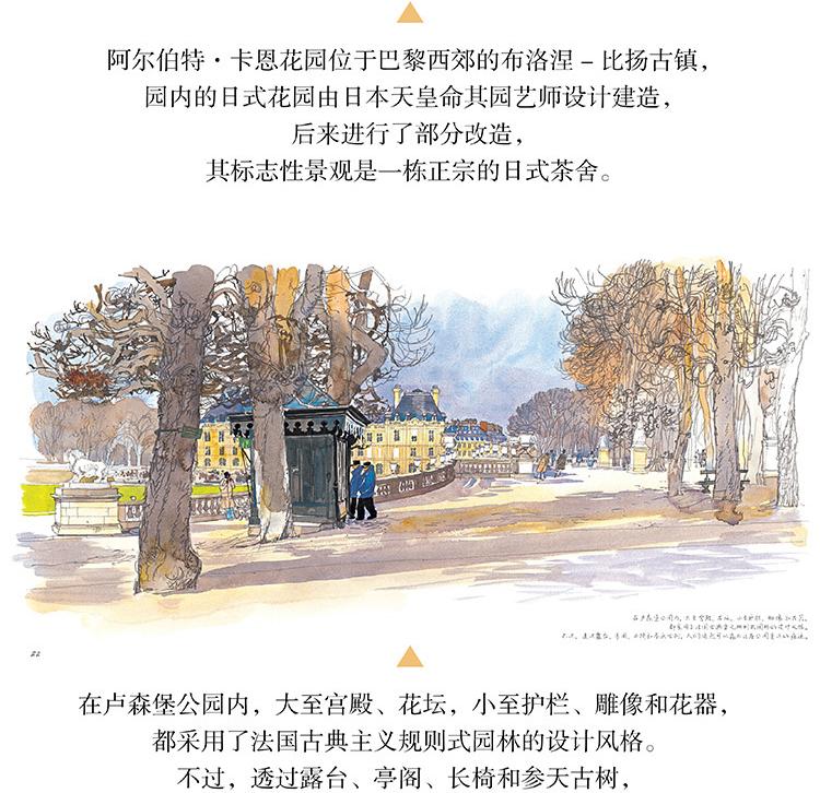 本書是一本人文主題的水彩畫集,用圖文並茂的方式為大家介紹了被譽為「世界花都」的巴黎里的各式花園,它們有的小巧迷人,有的宏大華麗;有的聲名遠播,有的鮮為人知,如:海明威去玫瑰園的盧森堡公園,巴黎的賞櫻地——蘇萊森鎮公園,世界的玫瑰堡花園,當然還有法蘭西的明珠——凡爾賽的花園……本書用百餘幅精美的水彩畫作展現了巴黎花園的四季美景;用詳細的文字講述了各式花園的設計理念、呈現特點、文化寓意以及園中種植的奇珍異草和與花園相關的歷史故事,充分展現了巴黎之木、寓意以及園中種植的奇珍。