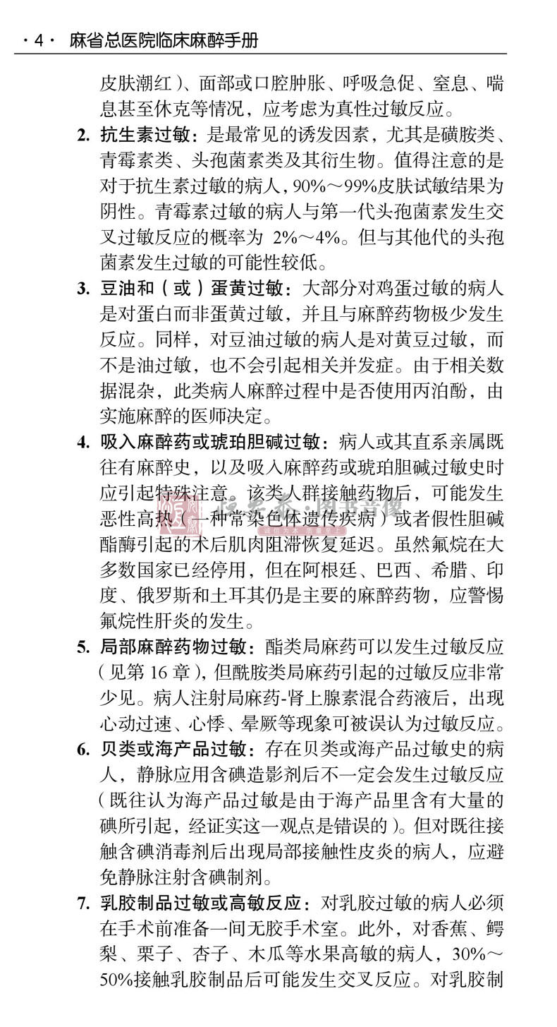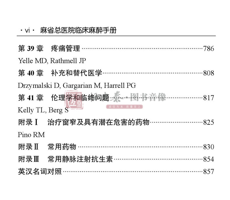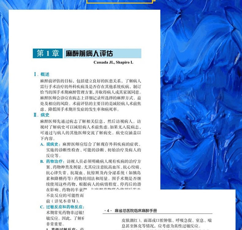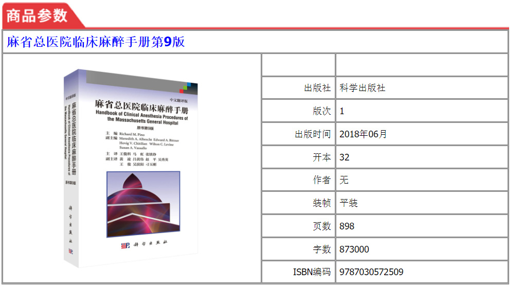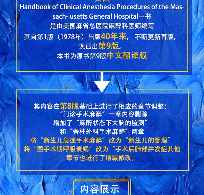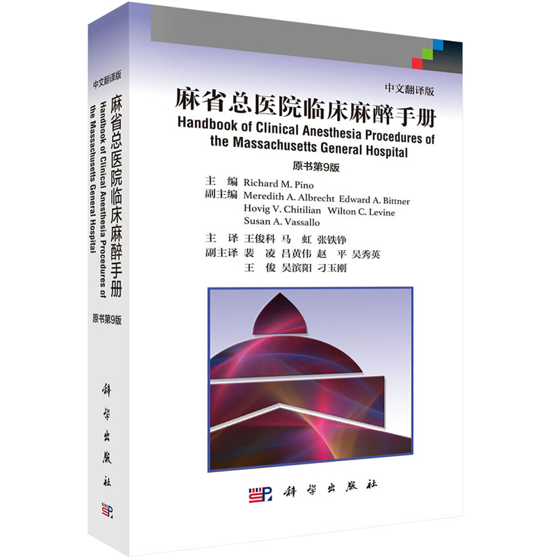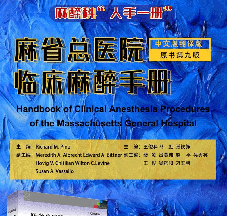 美國Handbook of Clinical Anesthesia Procedures of the Massach- usetts General Hospital一書,是由美國麻省總醫院麻醉科醫師編寫,其自第1版(1978年)出版40年來,不斷更新再版,現已出第9版。本書為原書第9版中文翻譯版,其內容在第8版基礎上進行了相應的章節調整:“門診手術麻醉”一章內容刪除,增加了“麻醉狀態下大腦的監測”和“脊柱外科手術麻醉”兩章;將“新生兒急症手術麻醉”改為“新生兒的管理”;將“圍手術期呼吸衰竭”改為“手術後肺部並發症”;其他章節也進行了增減修改。