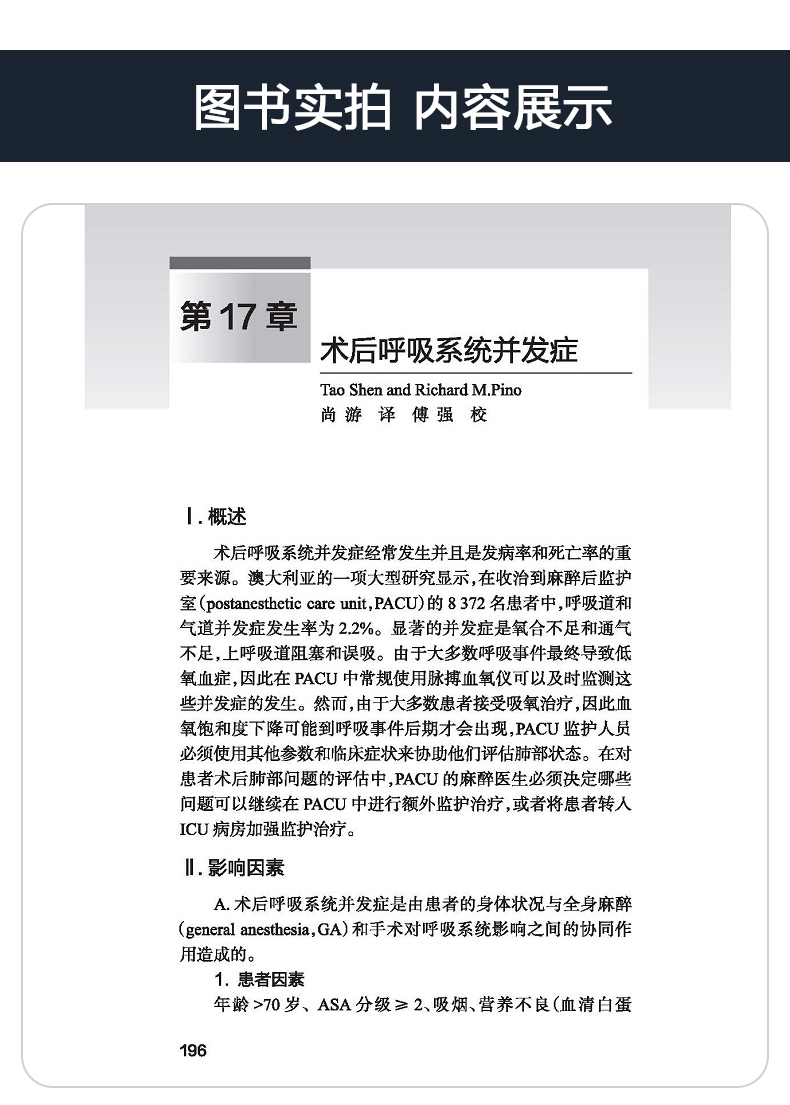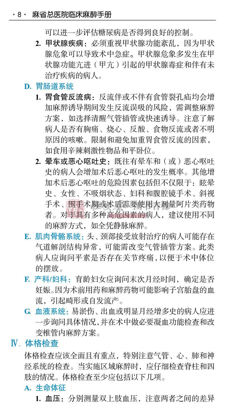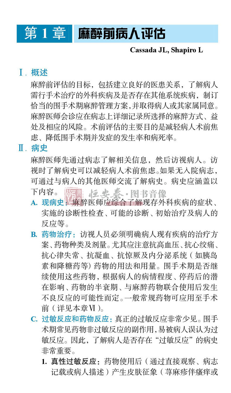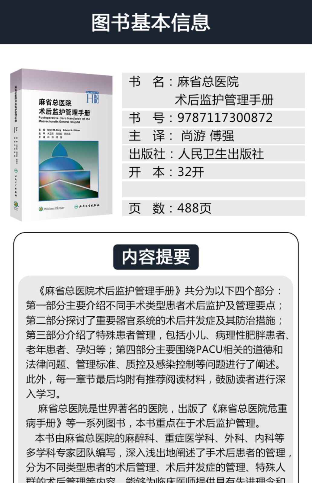 美國Handbook of Clinical Anesthesia Procedures of the Massach- usetts General Hospital一書,是由美國麻省總醫院麻醉科醫師編寫,其自第1版(1978年)出版40年來,不斷更新再版,現已出第9版。本書為原書第9版中文翻譯版,其內容在第8版基礎上進行了相應的章節調整:“門診手術麻醉”一章內容刪除,增加了“麻醉狀態下大腦的監測”和“脊柱外科手術麻醉”兩章;將“新生兒急症手術麻醉”改為“新生兒的管理”;將“圍手術期呼吸衰竭”改為“手術後肺部並發症”;其他章節也進行了增減修改。