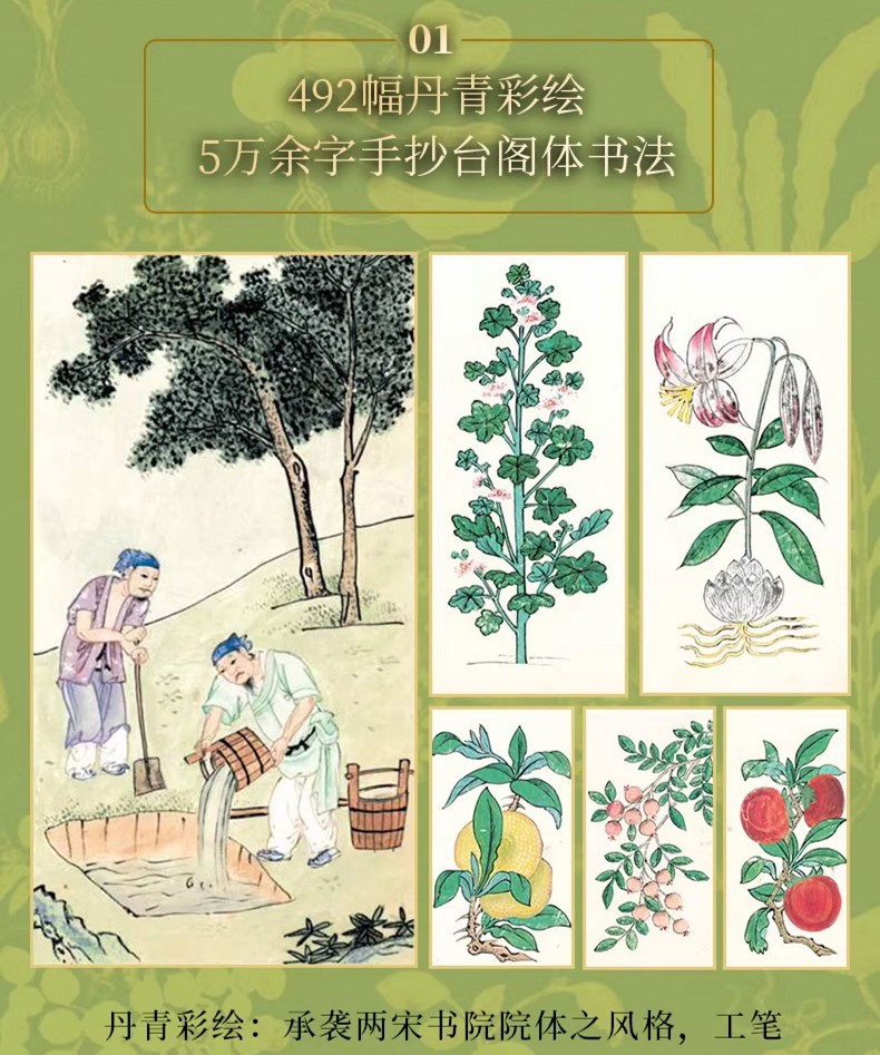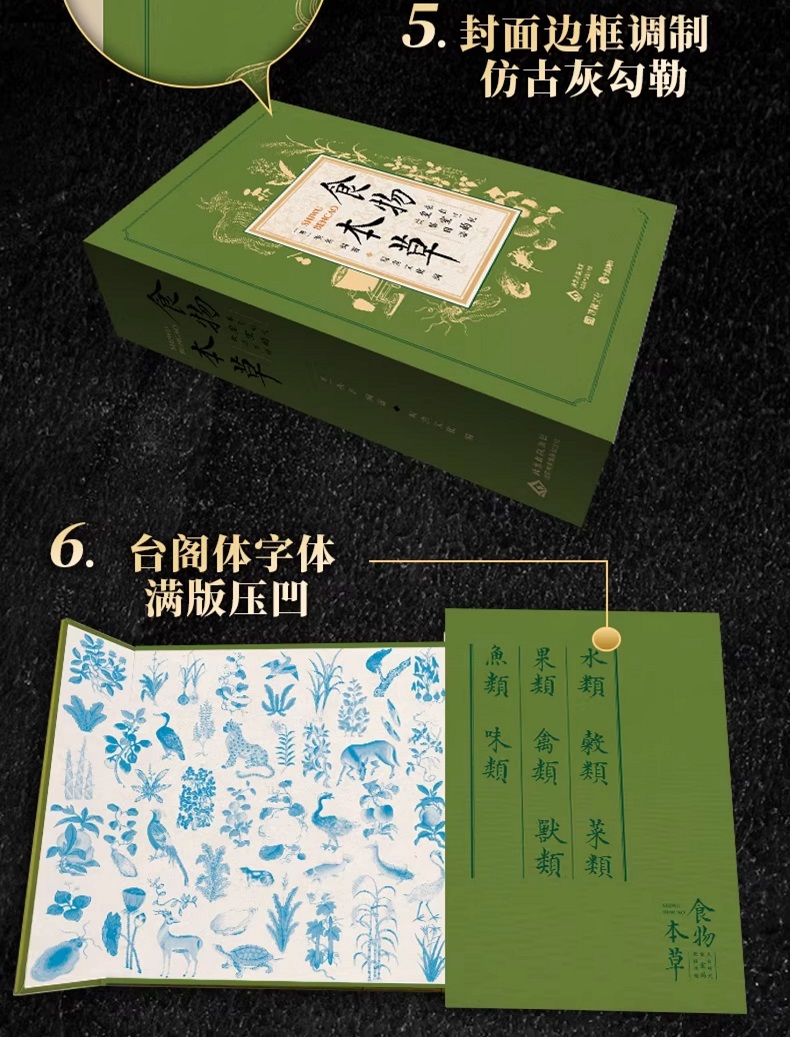 《食物本草》(共2冊) 布面磁吸雙冊連體裝幀,古典雅緻,三面書口噴潘通色 台閣書法壓凹 涵蓋水、穀、菜、果、禽、獸、魚、味8大類,共492種食物,492幅丹青彩繪,5萬餘字台閣體書法 附手紮套+藏書票