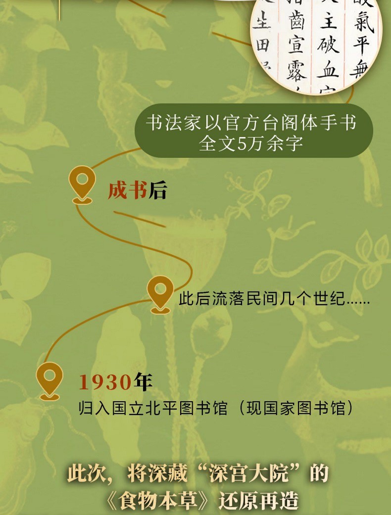 本書涵蓋水、穀、菜、果、禽、獸、魚、味8大類,共492種食物,492幅丹青彩繪,5萬餘字台閣體書法,內容幾乎囊括了中國17世紀以前所有見載於書籍中的食物。除了明代 《食物本草》 明抄彩繪本原本復刻,100張實景圖雲遊本草 + 39首本草詩詞。