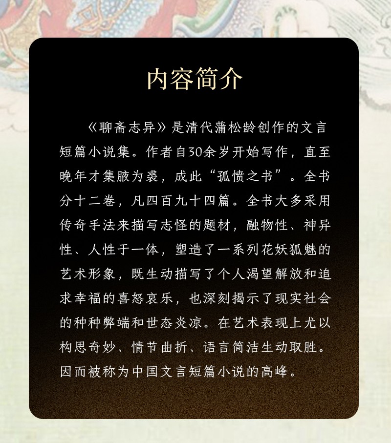 《聊齋志異》是清代蒲松齡創作的文言短篇集。作者從30餘歲開始寫作,直至晚年才集腋為裘,成此「孤憤之書」。全書分十二卷,凡四百九十四篇。全書多採用傳奇手法來描寫志怪的題材,融物性、神異性、人性於一體,塑造了一系列花妖狐魅的藝術形象,既生動描寫了個人渴望解放和追求幸福的喜怒哀樂,也深刻揭示了現實社會的種種弊端和世態炎涼。在藝術表現上尤以構思奇妙、情節折、語言簡潔生動取勝。因而被稱為中國文言短篇的高峰。