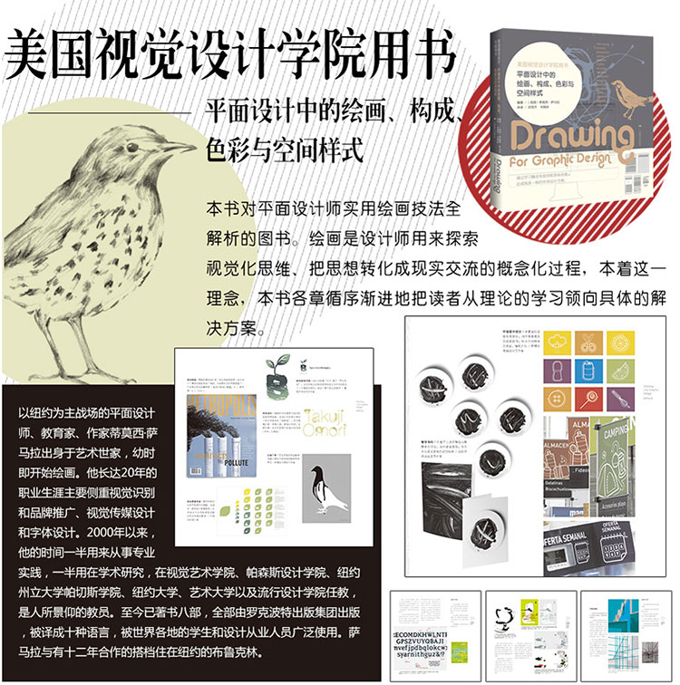 《美國視覺設計學院用書:平面設計中的繪畫、構成、色彩與空間樣式》對於想要把繪畫作為一種創意工具的各級設計學生和從業人員而言都是一本全面的必備參考書。本書作者、設計師提摩西‧薩馬拉為讀者呈現了一幅廣闊而包羅萬象的繪畫圖景,包括圖像化再現、圖標標誌設計、地圖及圖表製作、圖形翻譯、非圖像抽象化、字體設計、拼貼以及排版,能幫助讀者將繪畫納入他們的設計語言中。