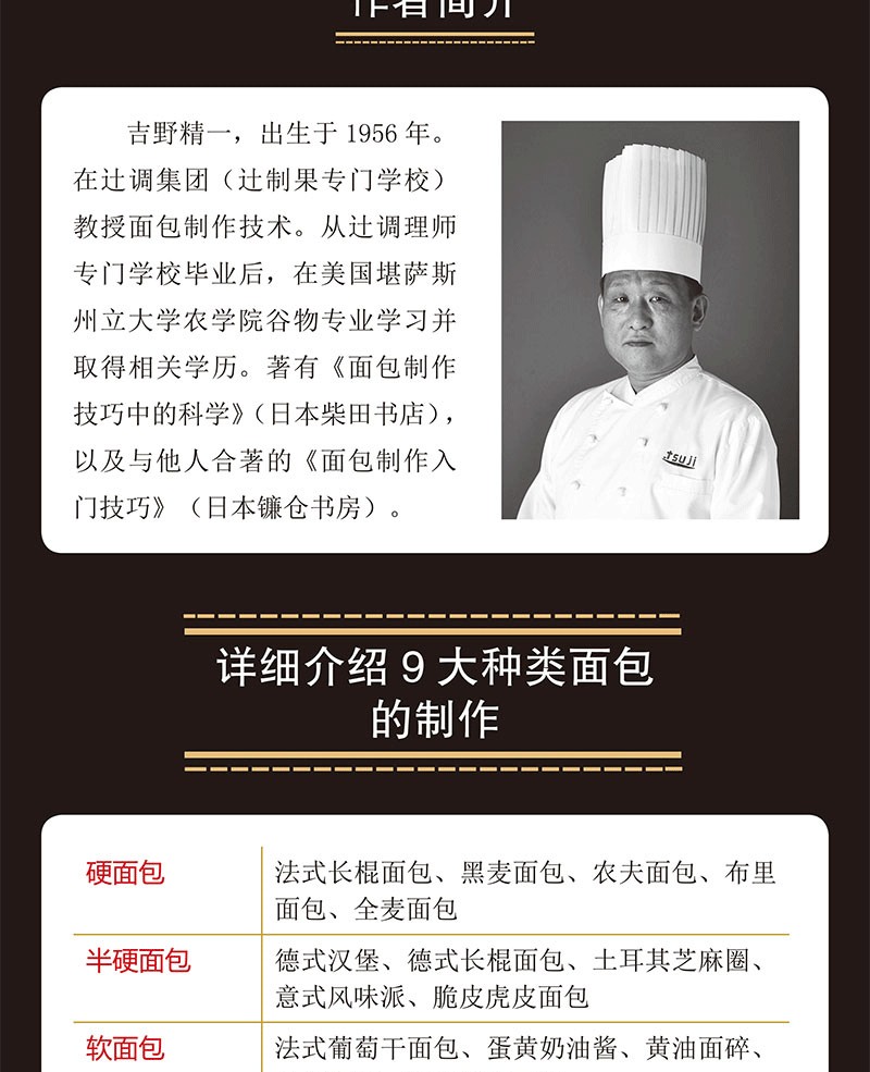 吉野精一,出生於1956年。在辻調集團(辻制果專門學校)教授麵包製作技術。從辻調理師專門學校畢業後,在美國堪薩斯州立大學農學院穀物專業學習並取得相關學歷。著有《麵包製作技巧中的科學》(日本柴田書店),以及與他人合著的《麵包製作入門技巧》(日本鎌倉書房)。