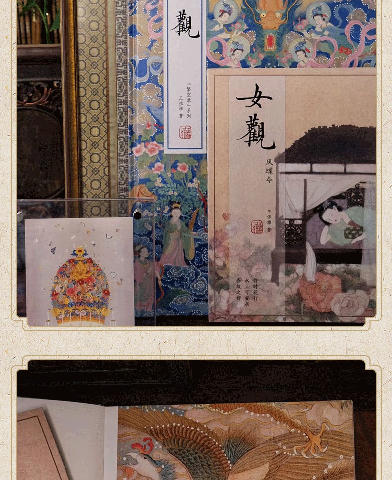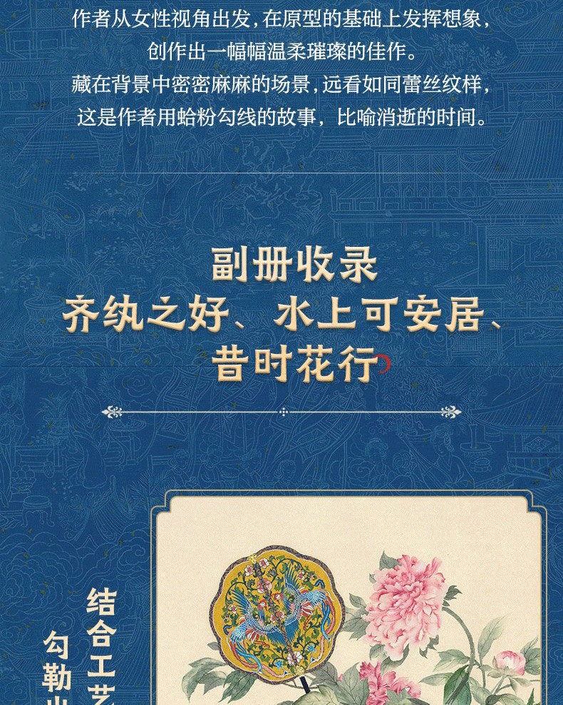 本書以高清作品圖、古詩詞與作者創作隨筆結合的方式,完整呈現了創作的意境與思想感情。 其中包含兩冊畫集:主體為「繁空錄」系列作品,圍繞鳳冠題材展開;副冊包含三個小單元,分別為團扇、花舫、仕女。 本書適合古典藝術和中國傳統文化愛好者閱讀和收藏
