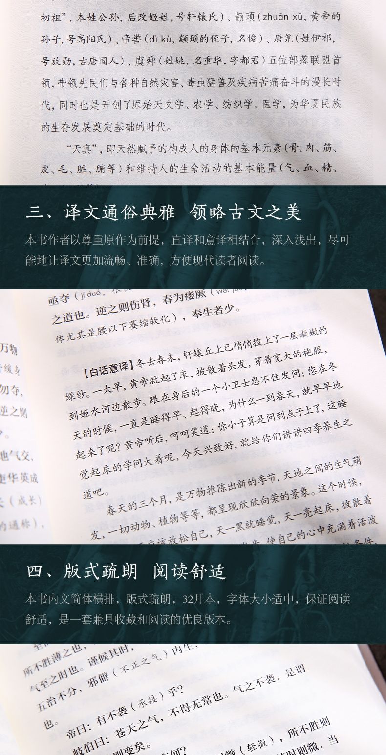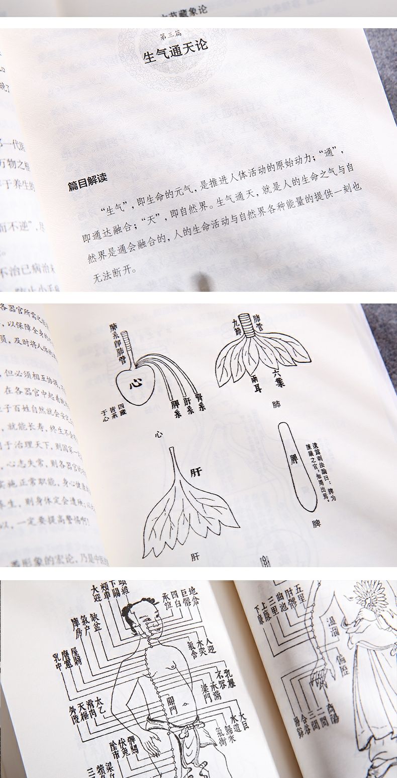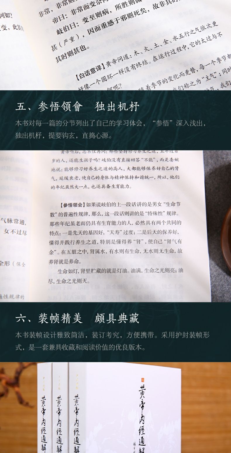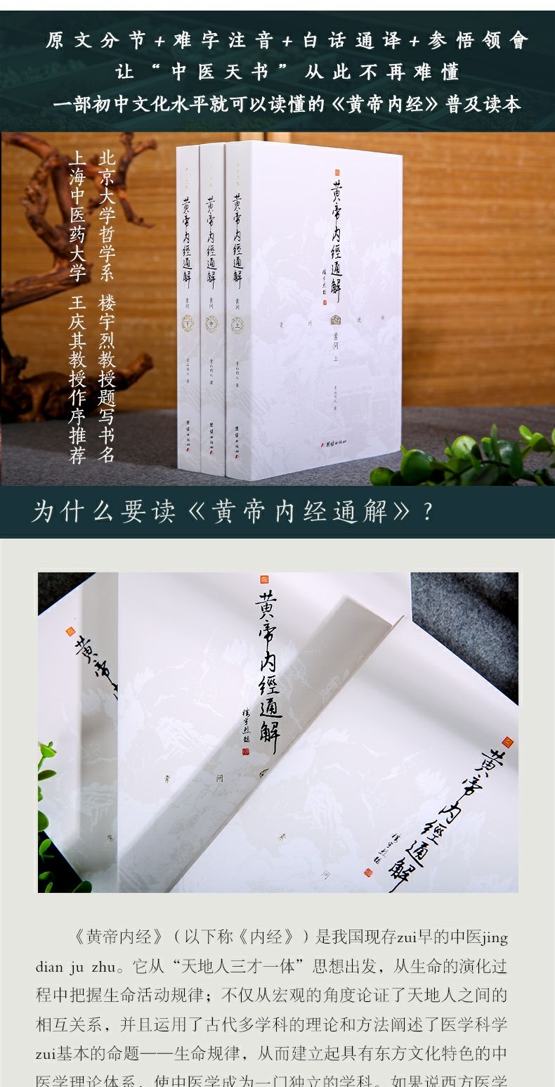 《黃帝內經(以下稱《內經)是現存最早的中醫經典巨著。它從「天地人三才一體」思想出發,從生命的演化過程中把握生命活動規律;不僅從宏觀的角度論證了天地人之間的相互關係,並且運用了古代多學科的理論和方法闡述了醫學科學zui基本的命題——生命規律,從而建立起具有東方文化特色的中醫學理論體系,使中醫學成為一門獨立的學科。如果西方醫學用形式邏輯與實證方法開啟了認識生命的一扇門,那麼《內經用傳統中華哲學智慧和豐富的實踐經驗為世界打開了認識生命的另一扇門。 《黃帝內經通解內容「解讀」通俗易懂,開門見山,深入淺出,且體例新穎,對《黃帝內經每一篇的內容進行了主題提煉,「參悟」獨出機杼,提要鉤玄,直搗心源。 《內經素有「其文簡,其意博,其理奧,其趣深」之說,《黃帝內經通解令艱澀難解、博大精簡的古代精神大白於世,使人似乎頓然領悟「大道zhi簡」的道理。