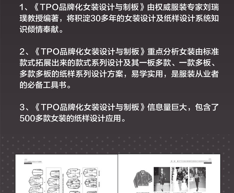 《TPO品牌女裝設計與製版》以系統導入女裝TPO國際規則為出發點,以企業市場化女裝設計與製板的有效結合為目標,對女士的西裝、外套、裙裝、禮服、休閒服和襯衫等主要品類的款式和紙樣系列設計方法與實踐進行了詳細、全面、系統的解析。以TPO為原則的“系列”設計方法與訓練,有助於改善國內“一款一板”的傳統打板方法,能有效地解決款式設計和板型設計嚴重脫節的問題,具有全新的技術含量和品牌化、市場化操作流程方式,能激發女裝設計的主動性和創新性,從而提升女裝產品設計的內涵和附加值。