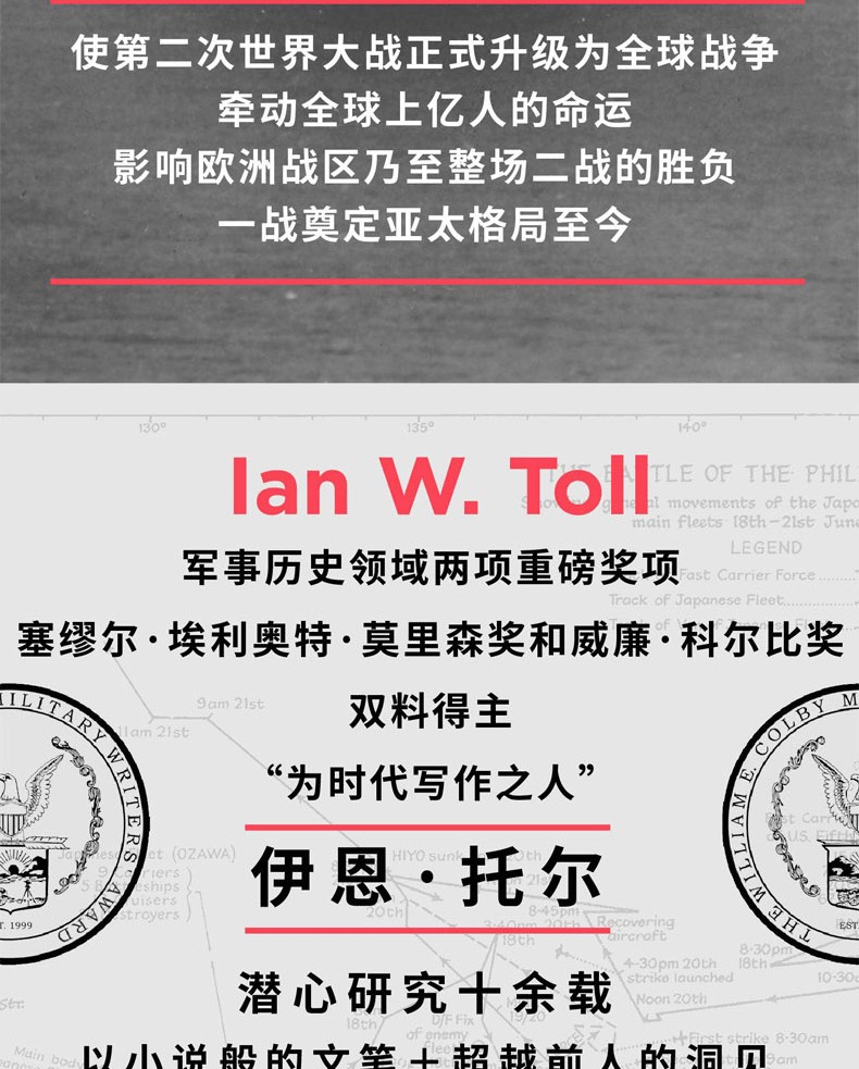 伊恩·托爾(Ian W. Toll),美國歷史作家、海軍歷史學者。他先後畢業于喬治敦大學和哈佛大學,曾短暫進入政界,之後又投身金融行業,在多家銀行擔任分析師。但他一直對從事歷史研究的夢想念念不忘,2002年開始專心從事寫作。