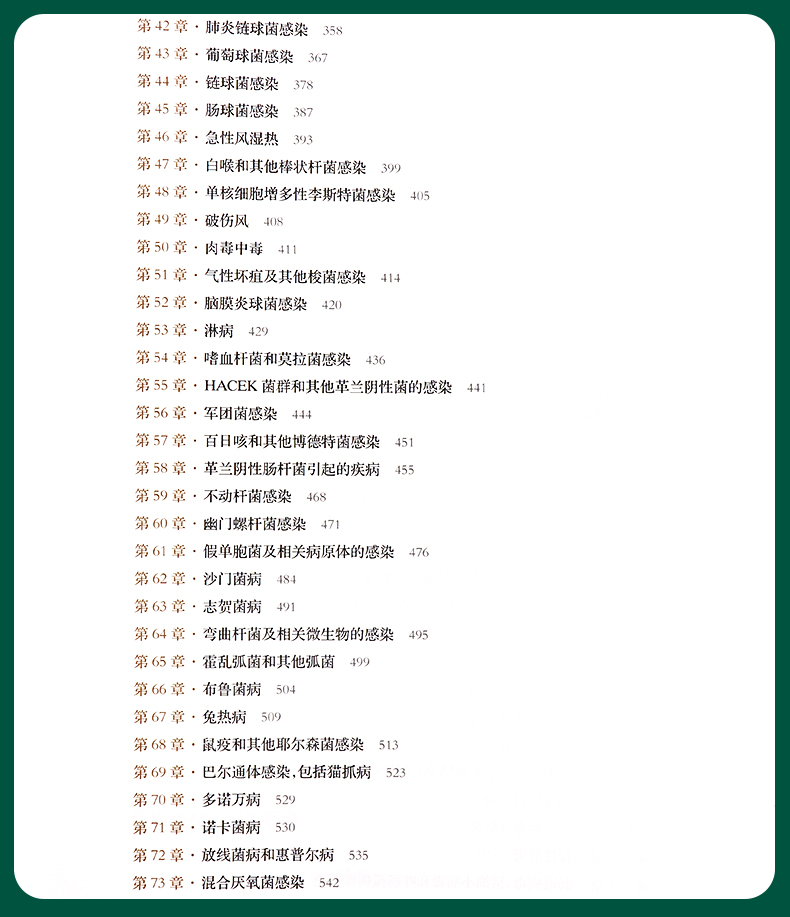 本書分為9篇,從3個不同角度對感染病進行分類介紹:首先是感染病總體論述,包括人體微生物組、感染機制、環境和人類行為與感染病的關係、疫苗等;其次為感染病相關症狀及系統、器官相關感染;最後則論述了不同病原體導致的感染病,包括各種常見及罕見的細菌、病毒、真菌、朊病毒、原生動物、蠕蟲、節肢動物,以及動物所致毒傷、咬傷等。全書從臨床診斷及治療的角度,從流行病學、病理生理學、遺傳因素、診斷、治療、預防、預後等多角度闡述了各種感染病。同時配有典型的臨床病例圖片、表格及相關診斷和治療流程圖等,幫助讀者更好地理解內容,是一本內容豐富、全面、實用的感染病學高級工具書。