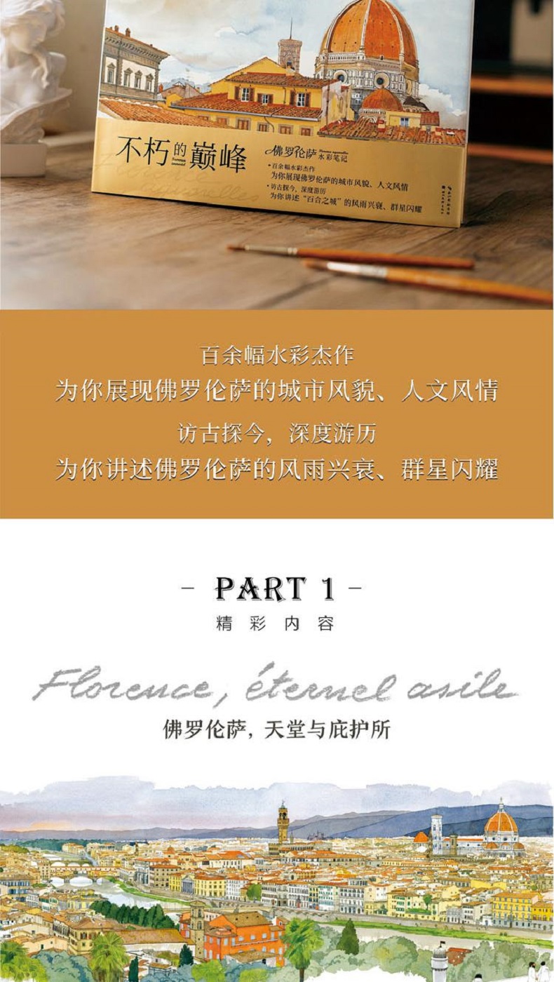 這是一本圖文結合,生動具體,探訪佛羅倫斯的完美指南。從教堂到博物館,從花園到宮殿,從廣場到蜿蜒小徑……150餘幅精美水彩展現佛羅倫斯的名勝古蹟與市井風貌;從人倫到宗教、從禁錮到變革、從壓抑到復興……講述佛羅倫斯的榮耀與衰亡。身未動心已遠,字裡行間跨越千年,《佛羅倫斯水彩筆記》帶你領略這座世間的天堂和心靈的避護所。