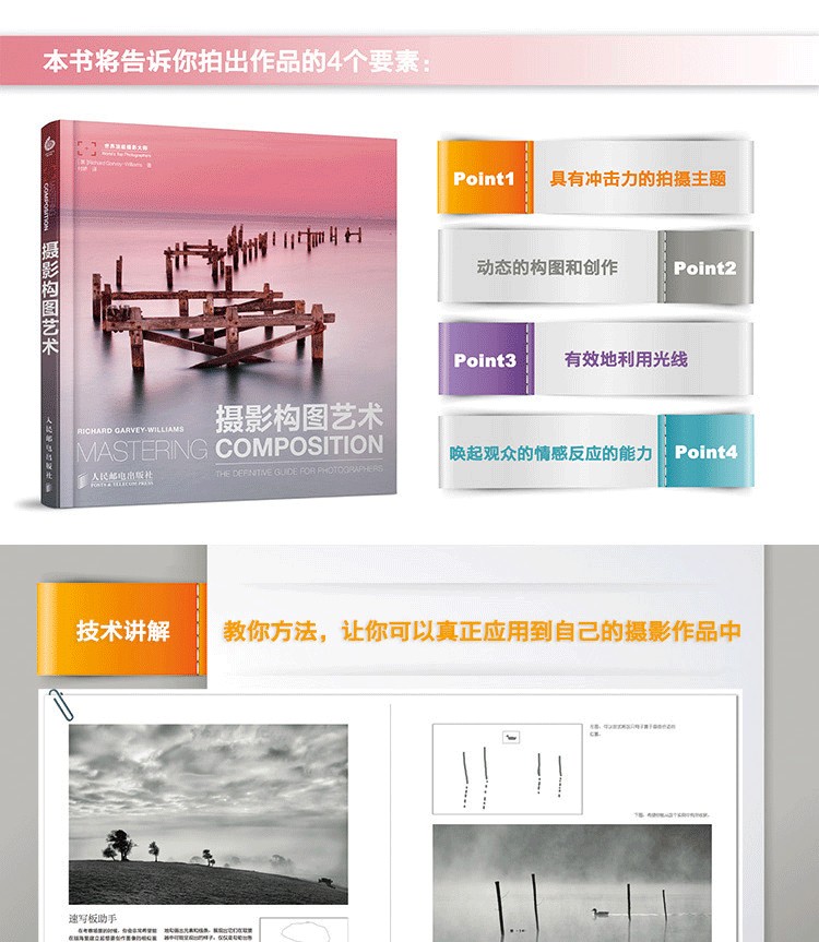 不同於常見的講解攝影構圖方法的工具書,《攝影構圖藝術》將攝影的構圖上升為一種對美學原理的探討。在這個過程中,作者以通俗易懂的分析和恰當合適的示例,建立起一套關於攝影構圖可以遵循的規則和方法。  《攝影構圖藝術》內容並不是單純地講解攝影構圖,作者在書中提出了構成優秀攝影作品的4個要素,其中能夠喚起觀眾的情感反應是其中最重要的一個要素。無論是剛入門的攝影初學者,還是已經有一定水平的攝影發燒友,通過本書,都能深入學習和深刻理解構圖是如何在傳達攝影師創作意圖中發揮作用的。