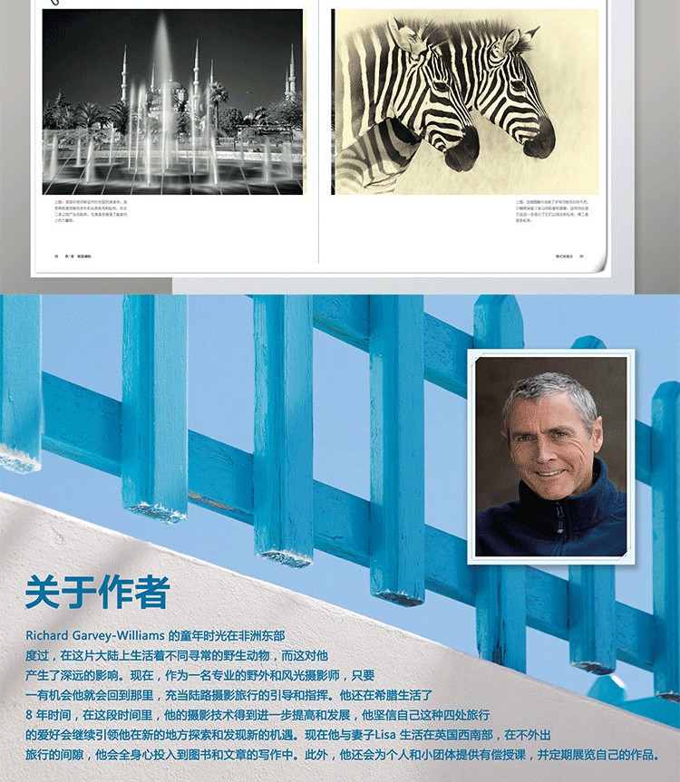 Richard Garvey-Williams 的童年時光在非洲東部度過,在這片大陸上生活著不同尋常的野生動物,而這對作者產生了深遠的影響。現在,作為一名專業的野外和風光攝影師,只要一有機會他就會回到那裡,充當陸路攝影旅行的引導和指揮。他還在希臘生活了8 年時間,在這段時間裡,他的攝影技術得到進一步提高和發展,他堅信自己這種四處旅行的愛好會繼續引領他在新的地方探索和發現新的機遇。現在他與妻子Lisa 生活在英國西南部,在不外出旅行的間隙,他會全身心投入到圖書和文章的寫作中。此外,他還會為個人和小團體提供有償授課,並定期展覽自己的作品。