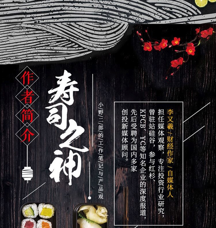 李又羲著的《壽司之神(小野二郎的工作筆記與產品觀)》是一本管理類人物傳記。本書通過描寫小野二郎的七十多年專注於製作壽司的故事,通過分享這位傳奇的米其林三星大廚在工作中的經驗與心得,展現了他對於廚藝的敬業態度。本書內容著重於小野二郎的產品觀和工作心得,多角度、多層次地介紹了一代職人的楷模,工匠精神的精髓。