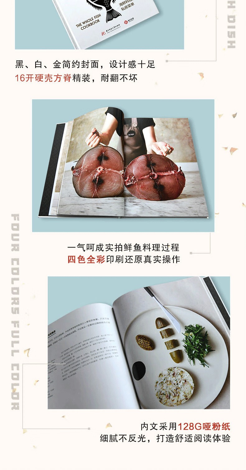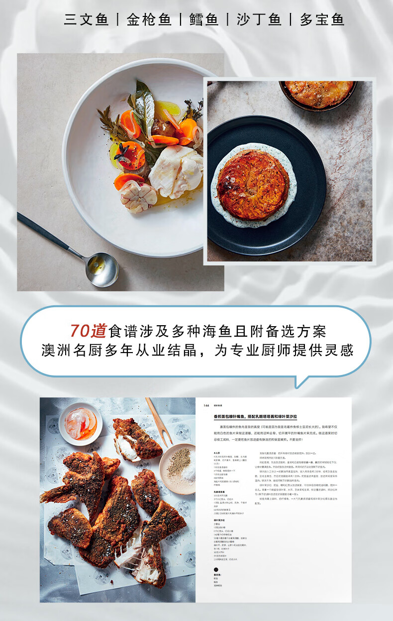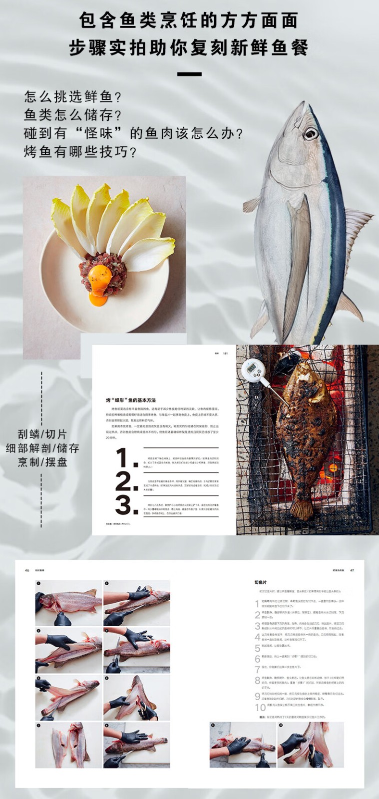 2.大廚私房創意食譜薈萃:書中包含70種魚類食譜,從煙熏馬林魚火腿到烤魚骨髓,從炸魚薯條到惠靈頓魚捲,作者詳細討論了煮、炸、烤、生食各種烹飪形式的技巧要點,食材涉及三文魚、石斑魚、金槍魚、多寶魚等多種海魚,並貼心地在每道菜譜下提出魚類備選方案。這些食譜是作者多年的從業結晶,對專業廚師有指導和啟發作用。