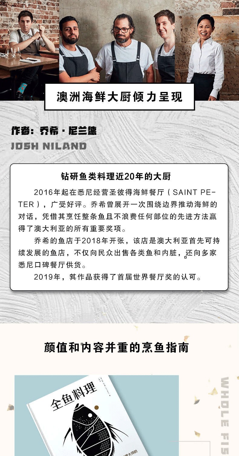 5.專業作者背書:作者喬希·尼蘭德(Josh Niland)是鑽研魚類料理近20年的大廚,2016年起在悉尼經營聖彼得海鮮餐廳(Saint Peter),廣受好評。喬希曾展開一次圍繞邊界推動海鮮的對話,憑藉其烹飪整條魚且不浪費任何部位的先進方法贏得了澳大利亞的所有重要獎項。喬希的魚店於2018年開張,該店是澳大利亞首先可持續發展的魚店,不僅向民眾出售各類魚和內臟,還向多家悉尼口碑餐廳供貨。 2019年,他的作品獲得了首屆世界餐廳獎的認可。 "