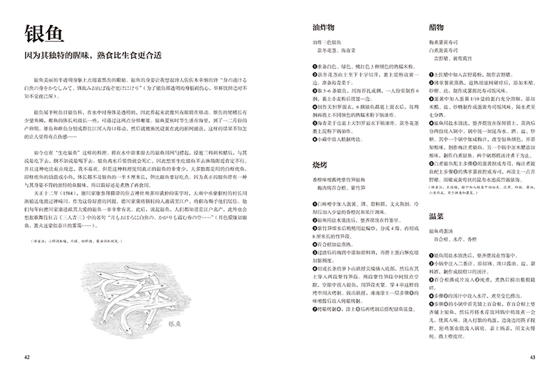 本書作者上野修三從青年時期便開始進入料理行業,從料理店學徒做起,逐步成為一代料理大師。上野修三尤其對魚料理頗有研究,他的烹飪特點是一條新鮮的魚從頭部到內臟都能毫不浪費地利用起來,真正做到“魚盡其用”。本書是他幾十年心血的總結,書中選取了日式料理中常用的88種魚貝類,其中44種按照春夏秋冬四季的順序進行了重點介紹,有我們熟悉的鯉魚、沙丁魚、帶魚、鯧魚,也有我們鮮少接觸的櫻花鯛、沙鑽魚、赤魟、鮐魚等。不但有詳細的食譜和製作步驟,還為讀者介紹了此種魚有趣的歷史故事及其背後蘊含的日本飲食文化,語言輕鬆幽默,讀起來趣味盎然。