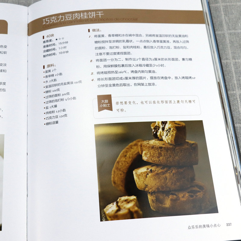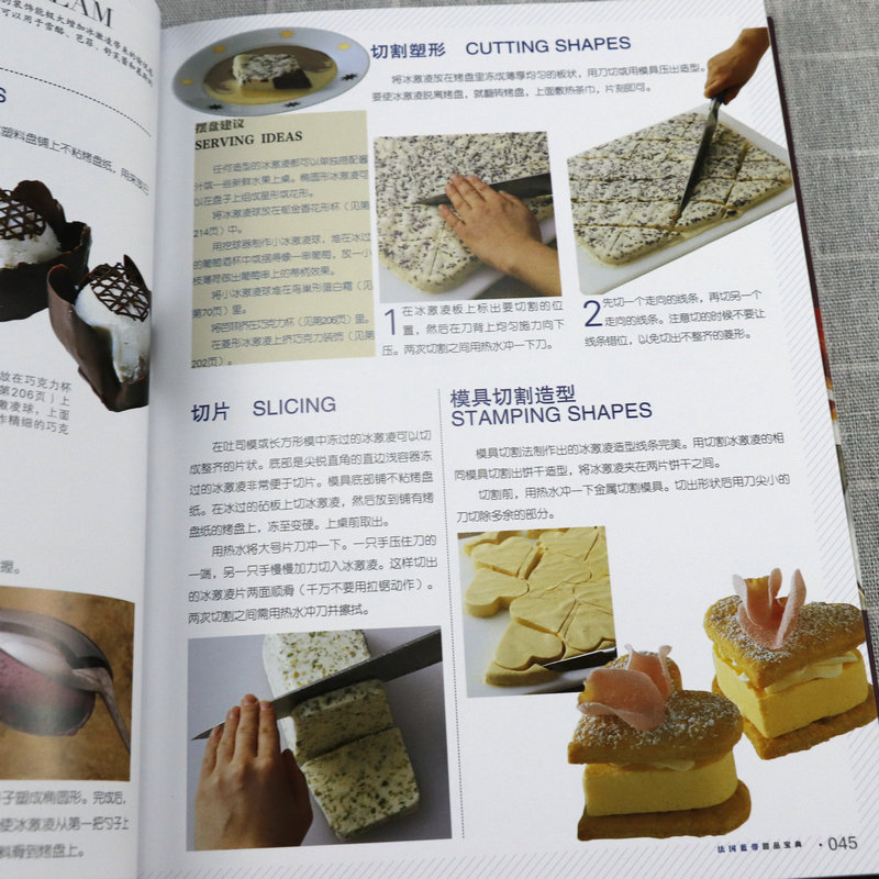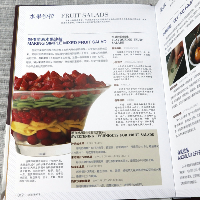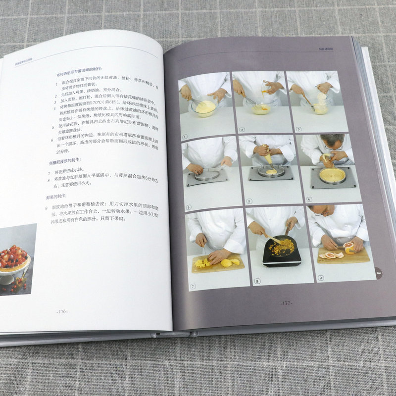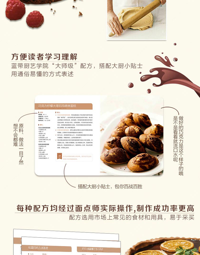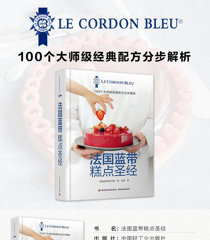 書中甜品突出法國藍帶廚藝學院特有的精緻裝飾和出眾技藝,單獨列出的參考部分則涵蓋製作麵糊、蛋白霜、沙司,以及加工水果、巧克力調溫、蛋糕裱花等所有基本技法。