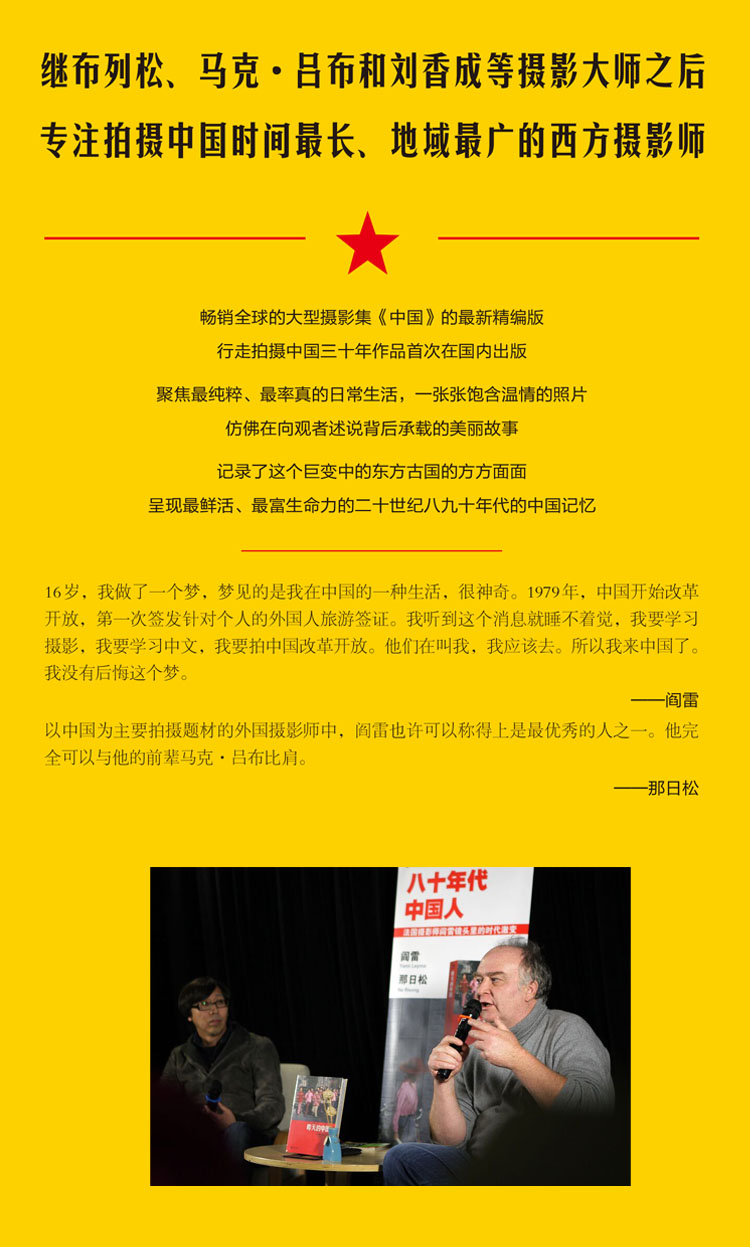 本書以閻雷的大型攝影集《中國》為底本,甄選並增補部分未公開發表的照片,重新編排成冊,全面呈現1985—2000年間處於轉型期的中國的日常生活、經濟起飛和社會巨變,用鏡頭為整個中國創作一幅很鮮活、很富生命力的肖像。
