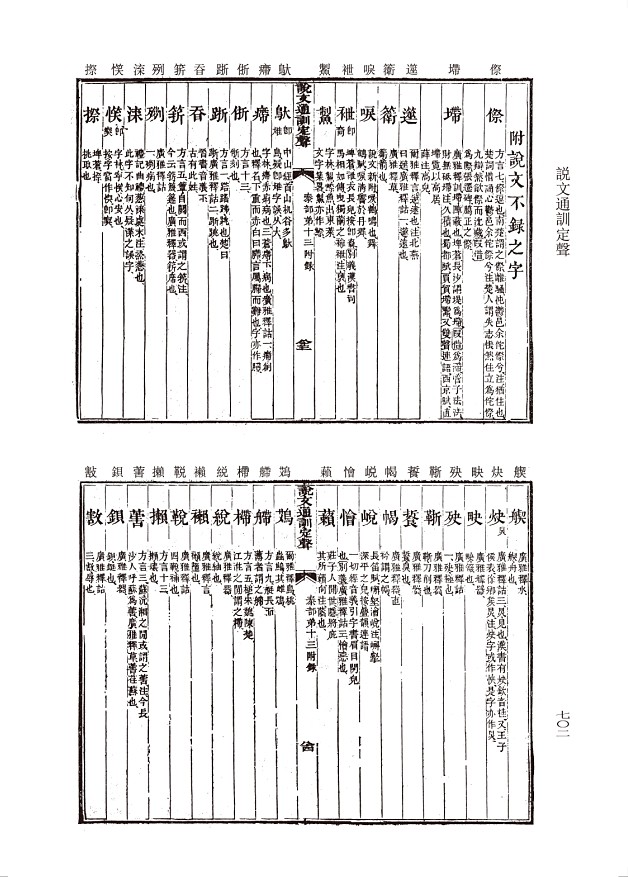 《說文通訓定聲》為朱駿聲之代表作。本書全面說解了字形、字音與字義:所謂“說文”是以許慎《說文解字》內容為基礎加以補充和舉例,通過字形說解本義;“通訓”主要講字義引申和同音通假,兼及聲訓;“定聲”是將《說文》五百四十部拆散,按古韻分為十八部,“以著文字聲音之源”。所謂無徵不信,本書不僅廣蒐故訓,更對所收集的材料加以系統分類,為我們研究上古漢語詞彙尤其是詞義引申和同聲假借現象提供了極大的方便,是我們研讀出土文字資料和古代文獻的參考書之一。