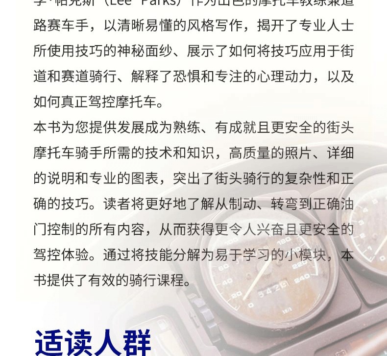 圖文全方位講解摩托車駕控技術,摩托車愛好者的推薦指南科普書本書從基礎駕駛到身心健康,甚至是賽道騎行等各個方面去教導摩托車愛好者如何騎好摩托車。本書通過圖文結合的形式深入淺出地分解每項騎行技術的基本原理,讓摩托車愛好者快速地理解如何學習騎行技術。希望本書能改變大家對摩托車的認知,提升摩托車愛好者的騎行水平,更加自由、安全地享受騎行生活。