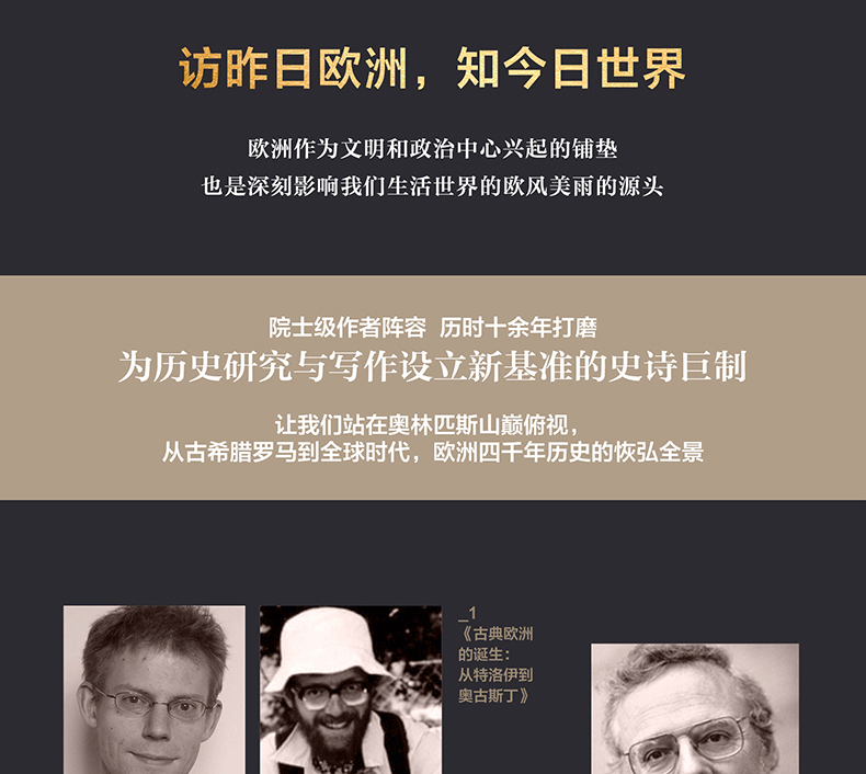 《古典歐洲的誕生》進入古希臘人、古羅馬人的記憶,看古典歐洲如何借助先民眼中的歷史創生。 《羅馬帝國的遺產》揭開羅馬帝國隕落後,記憶與製度如何在歐洲各地過渡、變更,恢復中世紀早期本有的光彩。 《中世紀盛期的歐洲》循王權和教權的纏鬥、信仰和理性的革新講述歐洲中世紀的複興,以及突然臨到的瘟疫與飢荒。