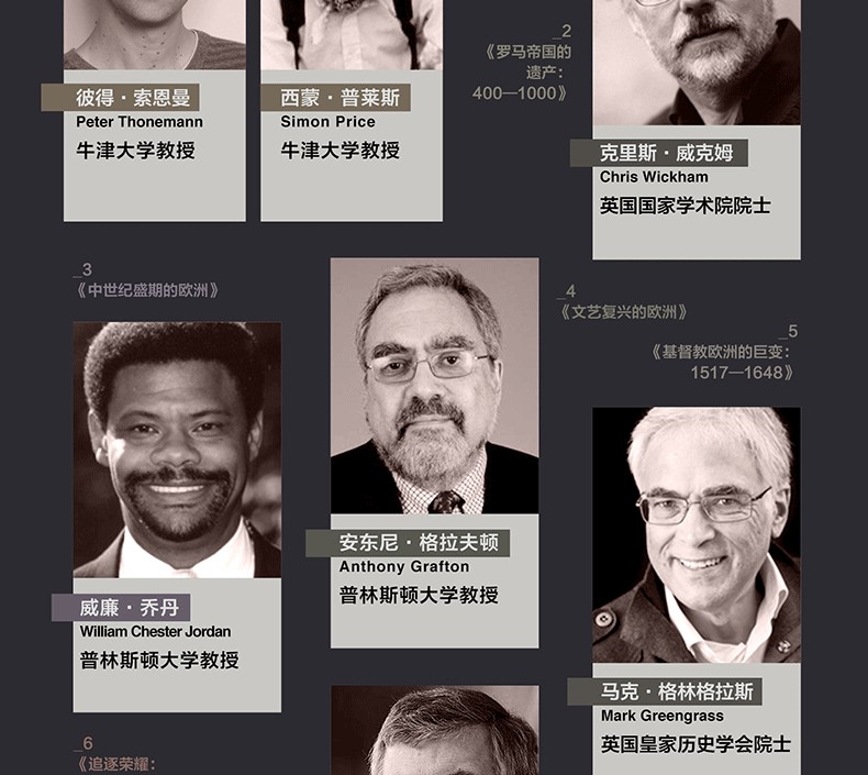 “企鵝歐洲史”系列由企鵝蘭登出版集團邀九位享譽世界的歐洲史學者聯合撰寫,自2004年起陸續出版。執教於牛津、劍橋、普林斯頓大學等學府的九大學者,以多年治學功力帶你在近四千年的漫長時間線上行走,描畫出九段全景、鮮活、豐盈的歷史,是公認的多卷本歐洲史新高峰。