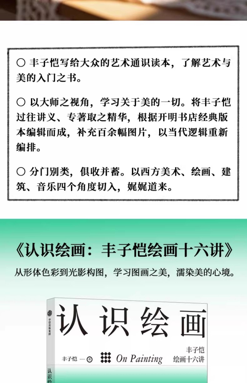 凝結一代國民巨匠的思想精華,從經典通識中汲取藝術養分,重拾大師見解。豐子愷不僅是一代藝術家、文學家,也是早期主張「美育」的先驅。他先後出版的多部藝術專著,是當時青年學生重要的藝術啟蒙讀本,是他主張「為人生而藝術」的具體實踐。系列將豐子愷過往講義、專著取之精華,根據開明書店經典版本重新編輯,補充百餘幅圖片,以當代邏輯編排,更易接受和進入。以大師之視角,學習關於美的一切。